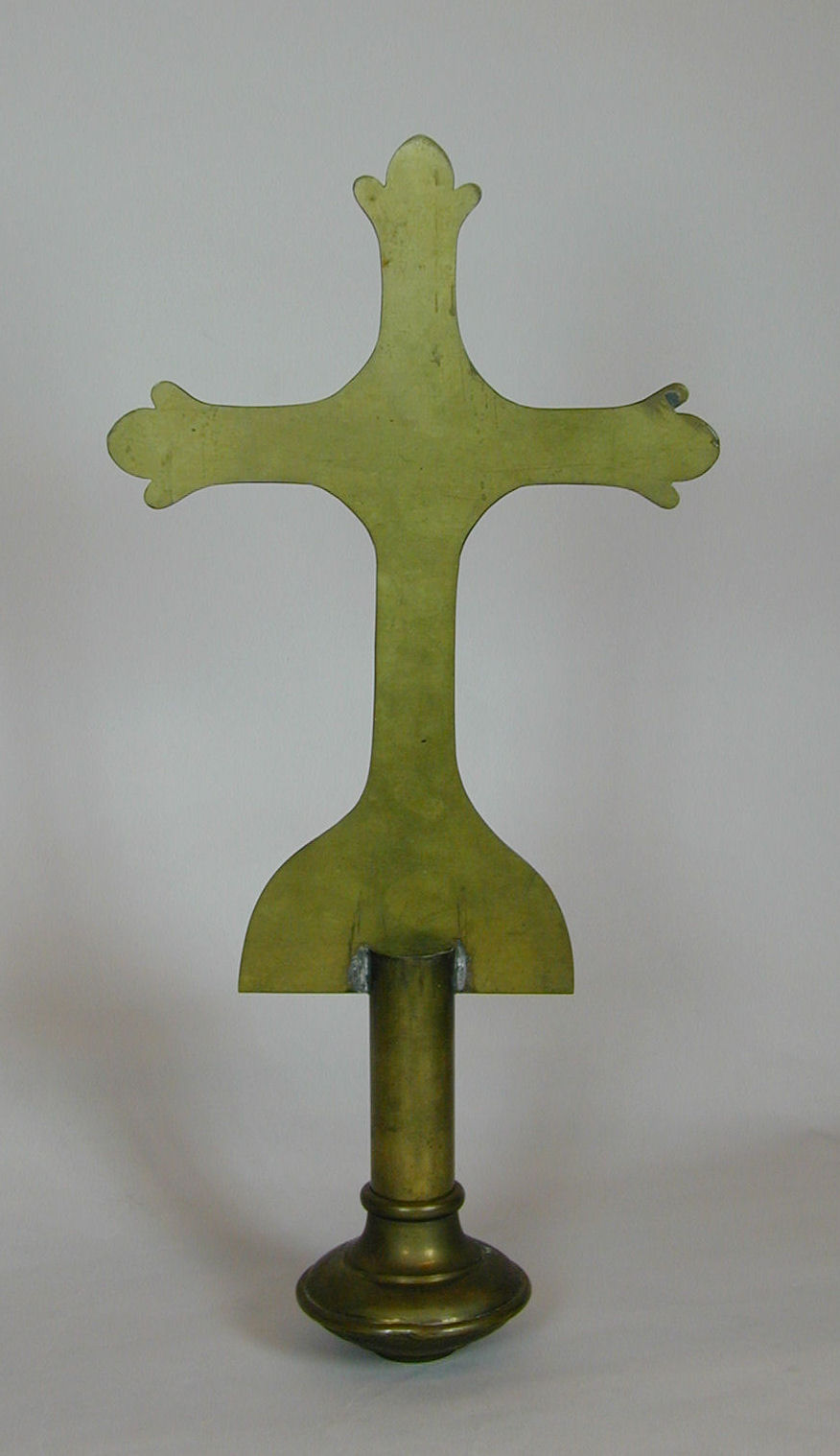 Vaandelbekroning uit drie losse delen: kruis, cylindervormige buis en een knop