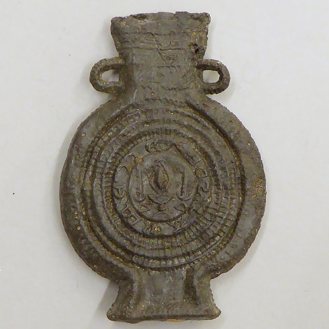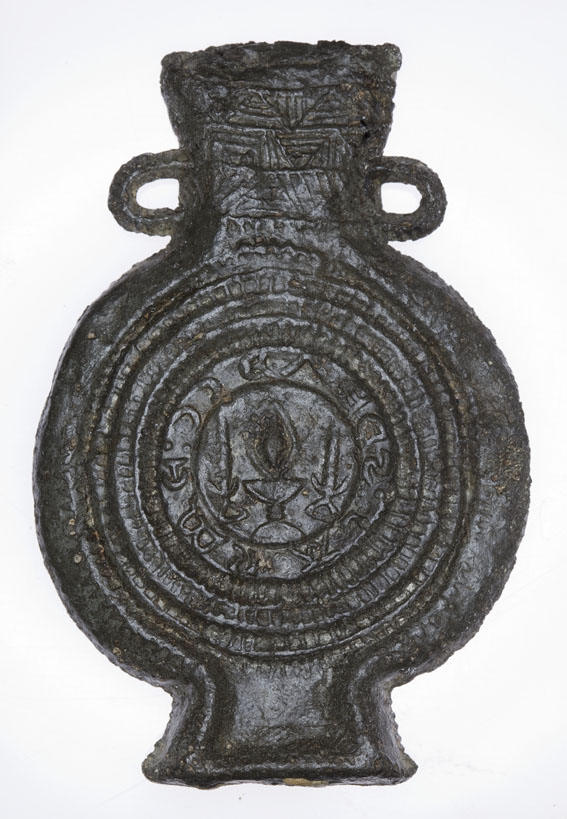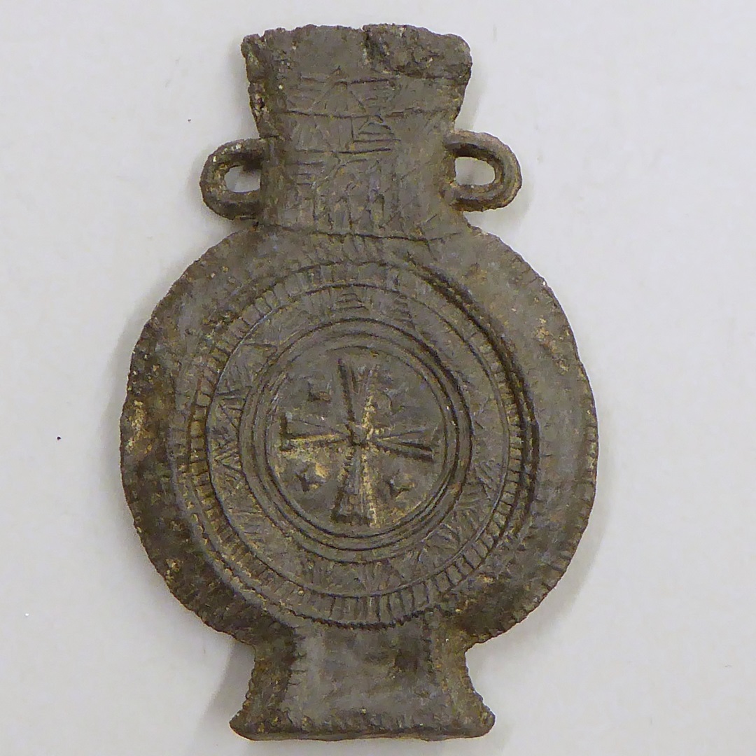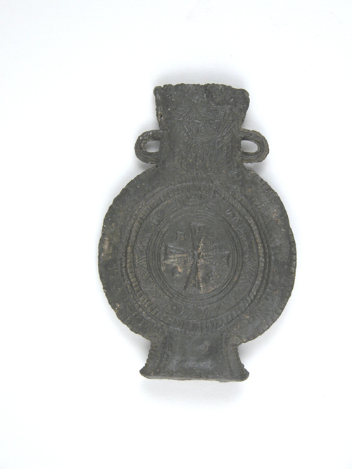 Pelgrimsampul met 'Lacrima Christi' waarop kruis, aan andere kant een kelk waarboven een traan