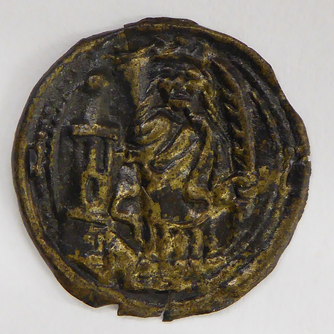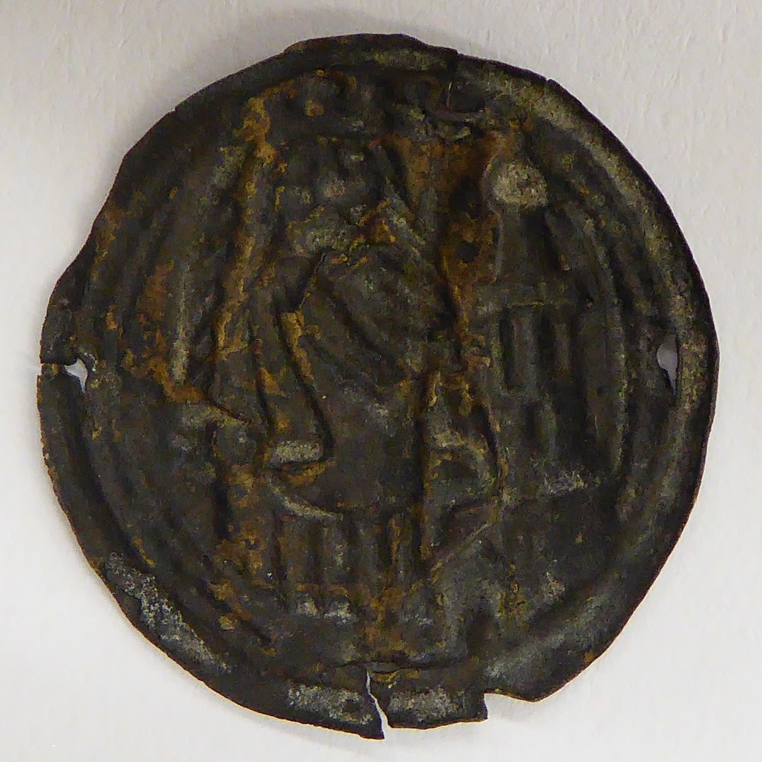 Pelgrimsinsigne, rond, met St. Barbara met in linkerhand palmtak en toren aan haar rechterzij