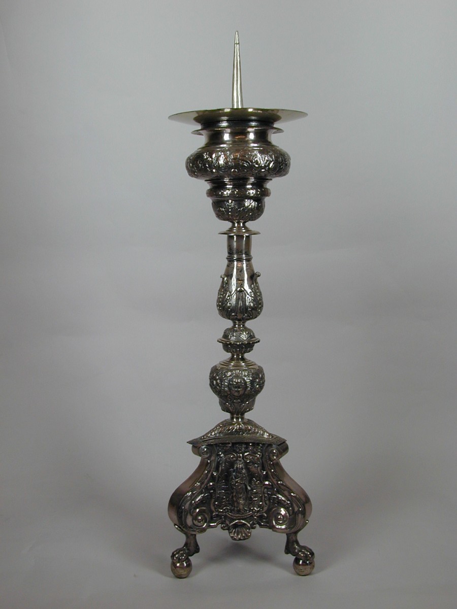Kandelaar op drie klauwpoten met HH. Catharina, Lidwina en Maria met kind