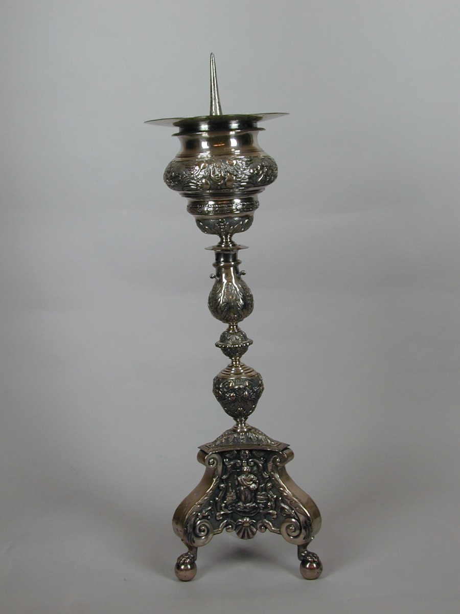 Kandelaar op drie klauwpoten, aan de voet versierd met symbolen van geloof, hoop en liefde