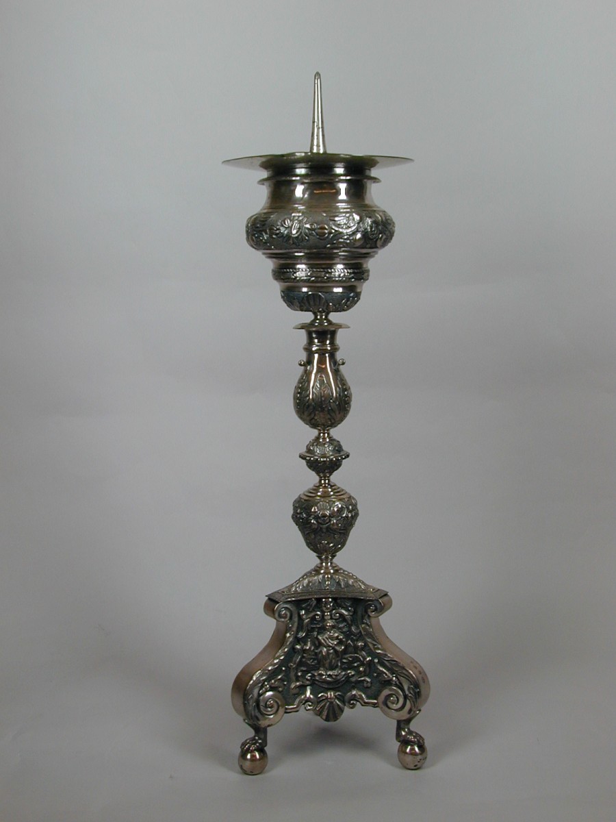 Kandelaar op drie klauwpoten, aan de voet versierd met symbolen van geloof, hoop en liefde