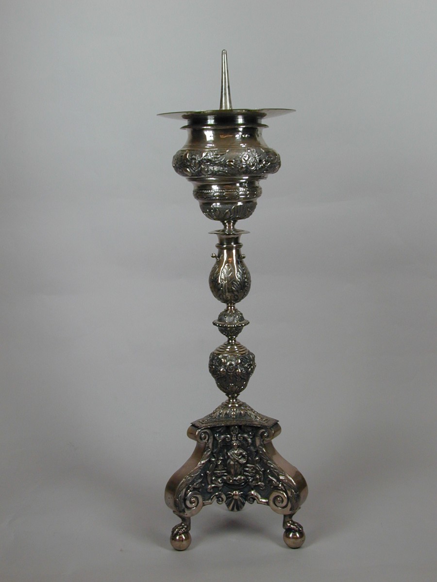 Kandelaar op drie klauwpoten, aan de voet versierd met symbolen van geloof, hoop en liefde