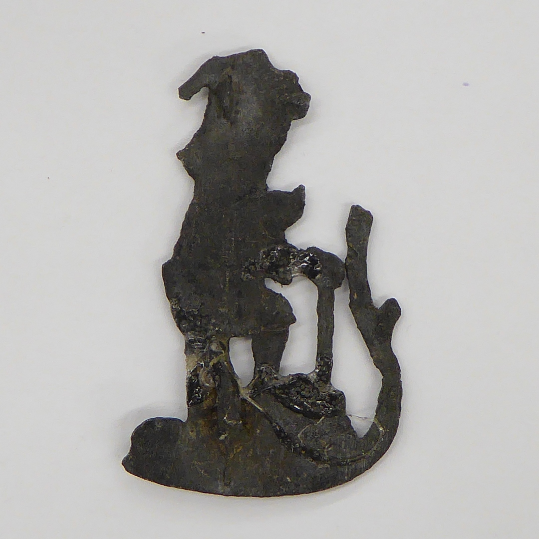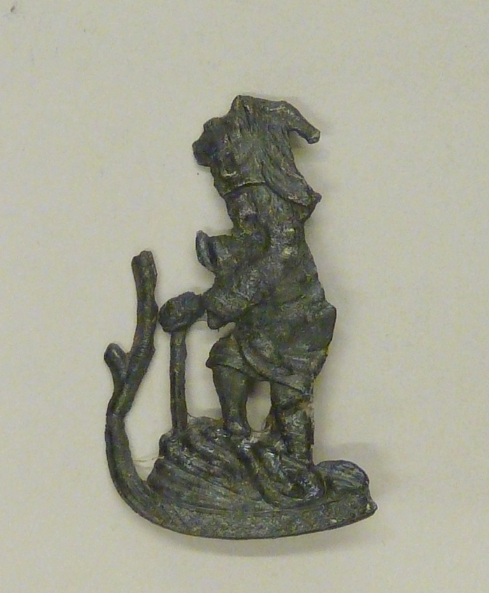 Pelgrimsteken, opengewerkt, met St. Christoffel staande in het water met Christuskind (hoofdloos)
