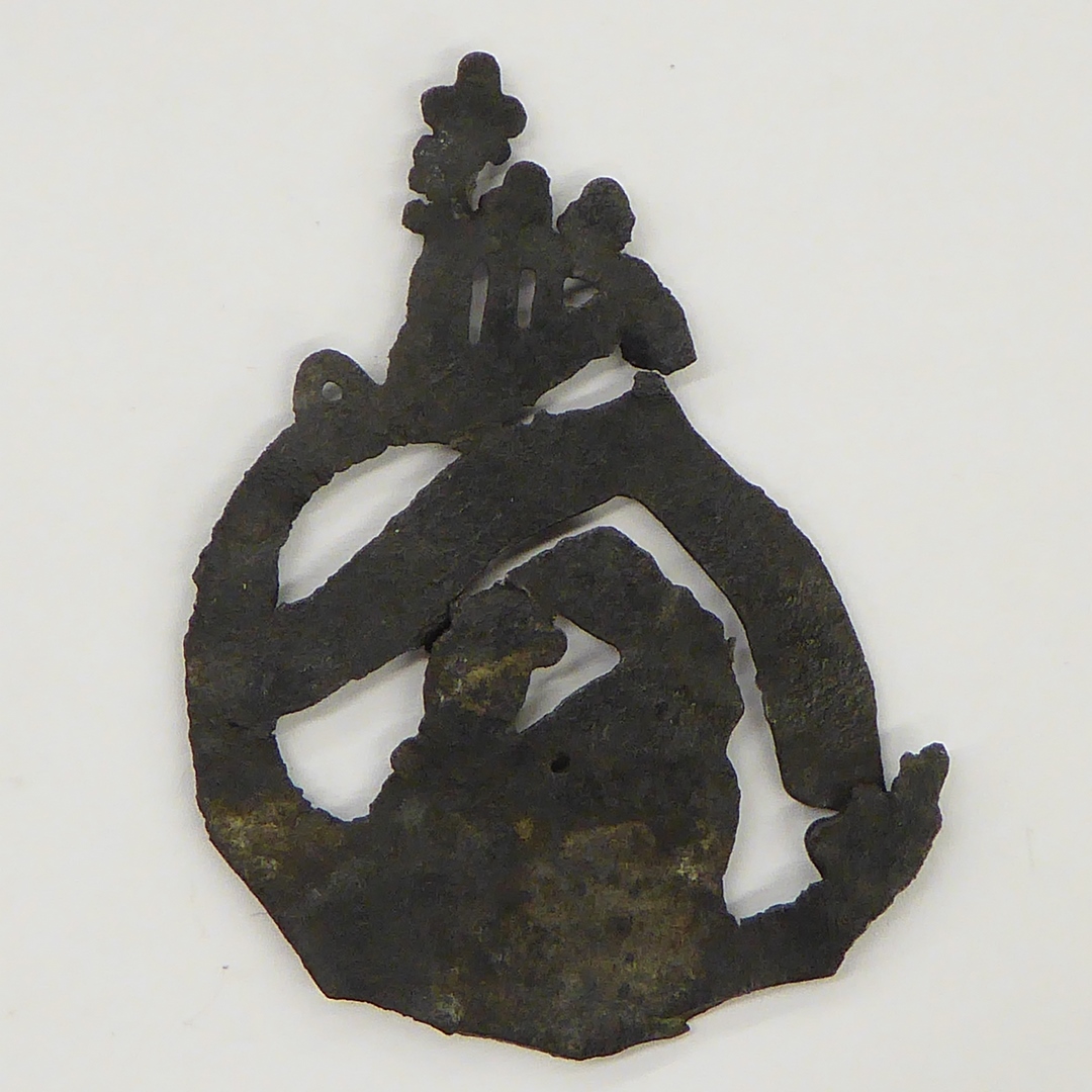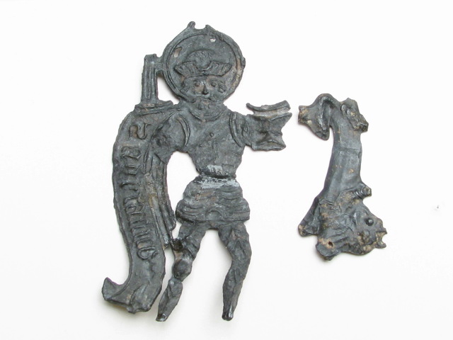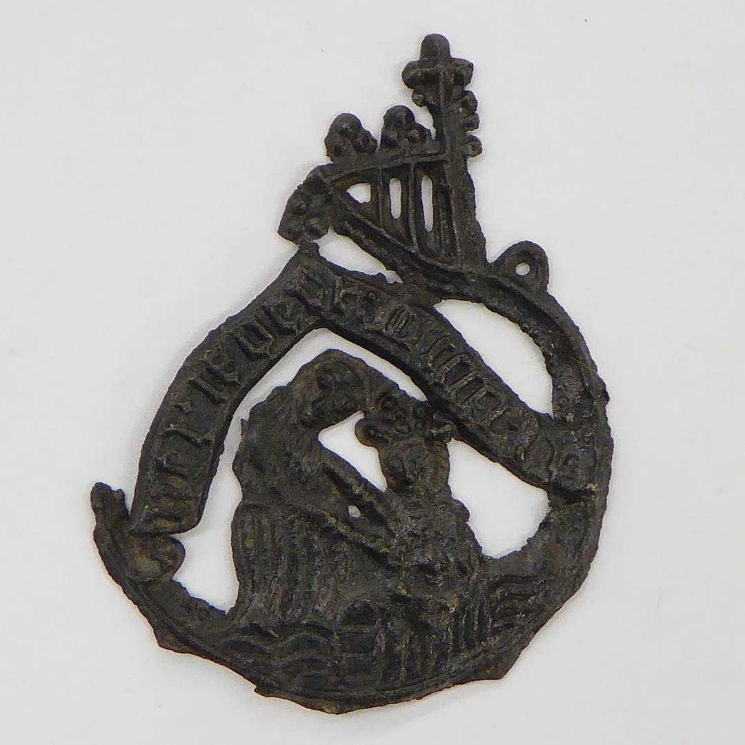 Pelgrimsteken, rond, opengewerkt, met Onze Lieve Vrouw Amersfoort, met vrouw die Mariabeeld vindt