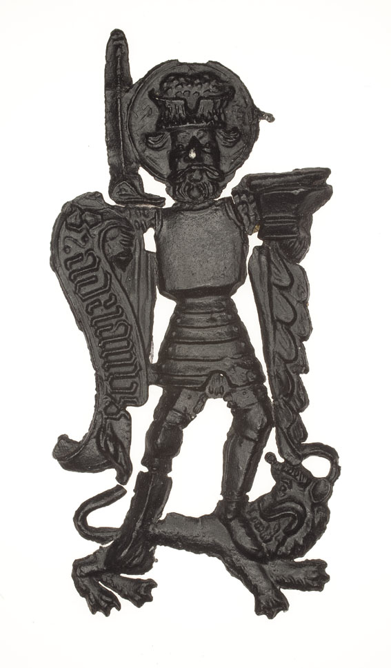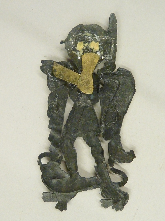 Pelgrimsinsigne, opengewerkt, St. Adrianus, geharnast staande op een leeuw