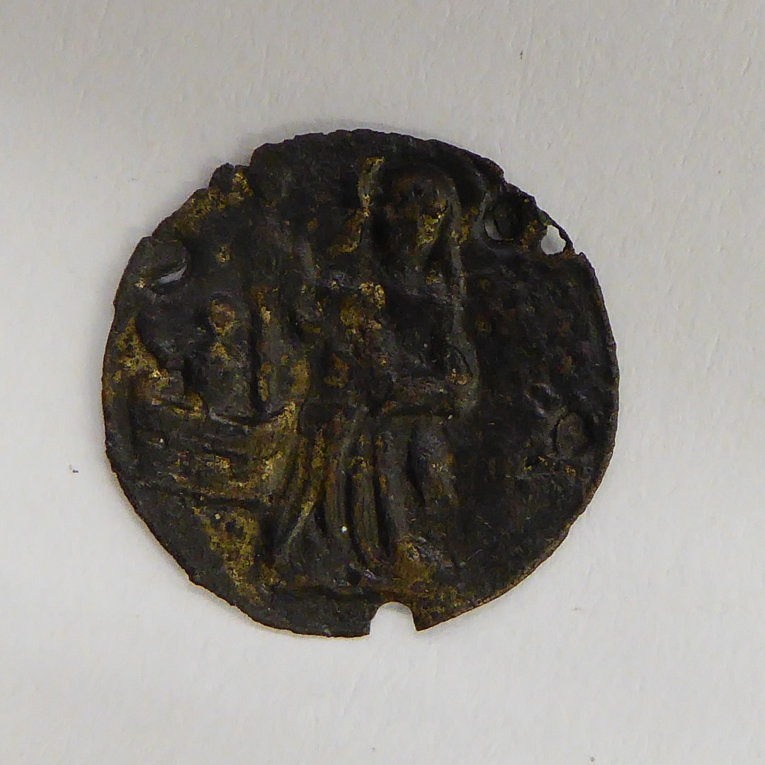 Pelgrimsinsigne, rond, gesloten, met geknielde vrouw(?) voor figuur in bootje(?)