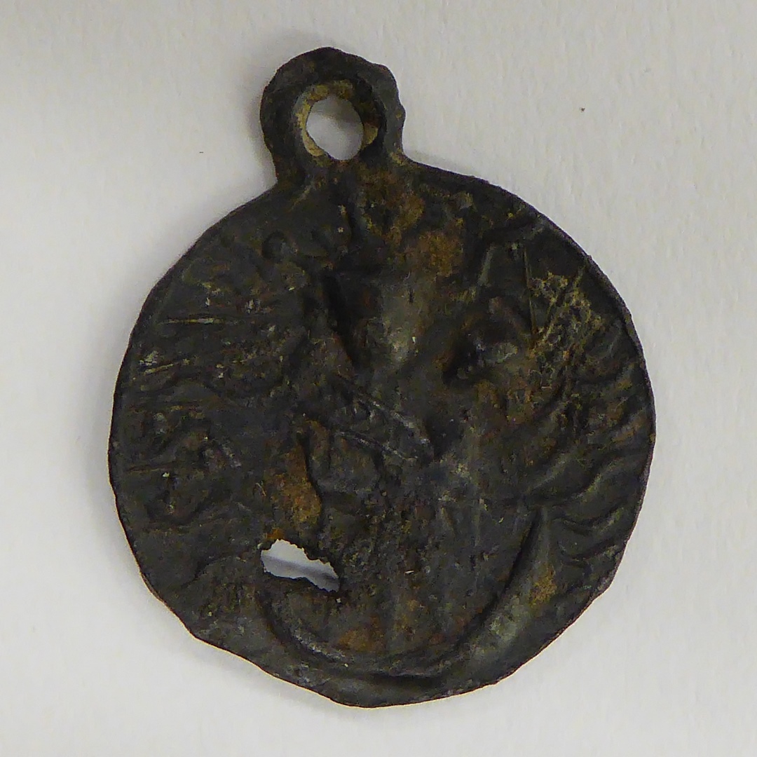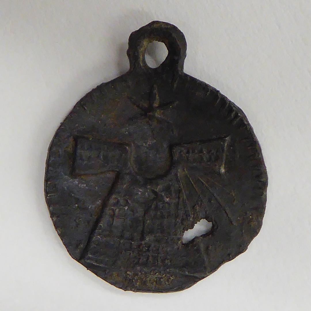 Pelgrimsinsigne, rond, gesloten, met Onze Lieve Vrouw, kz. de tunica van Aken