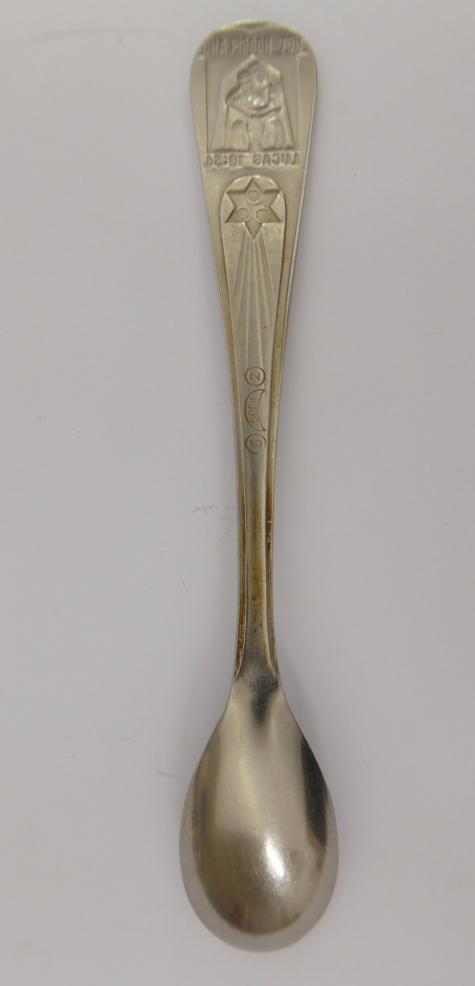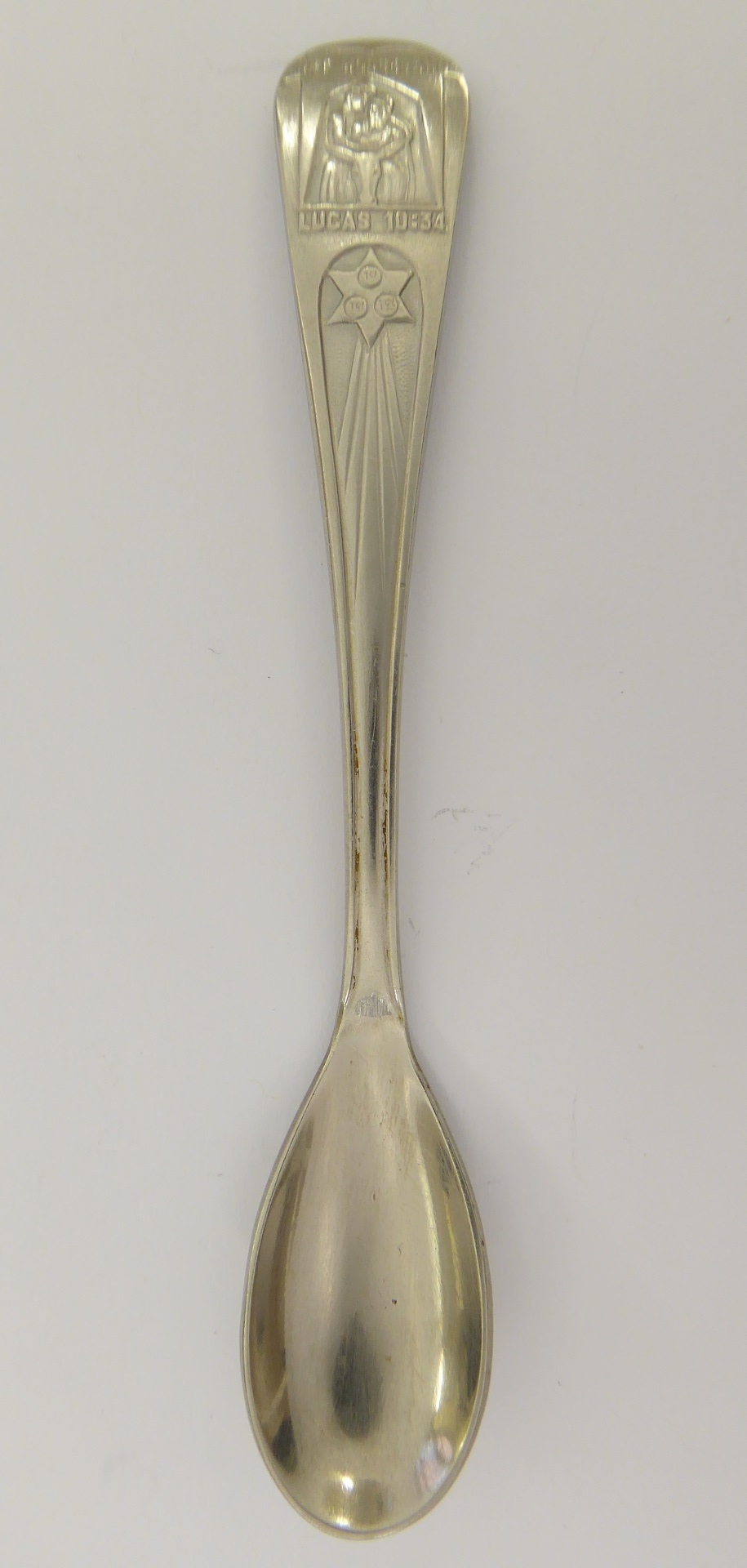 Theelepel met "Het Hoogeland Lucas 10:34", met barmhartige Samaritaan en zespuntige ster