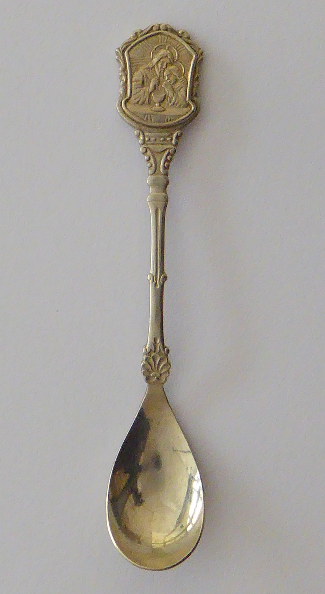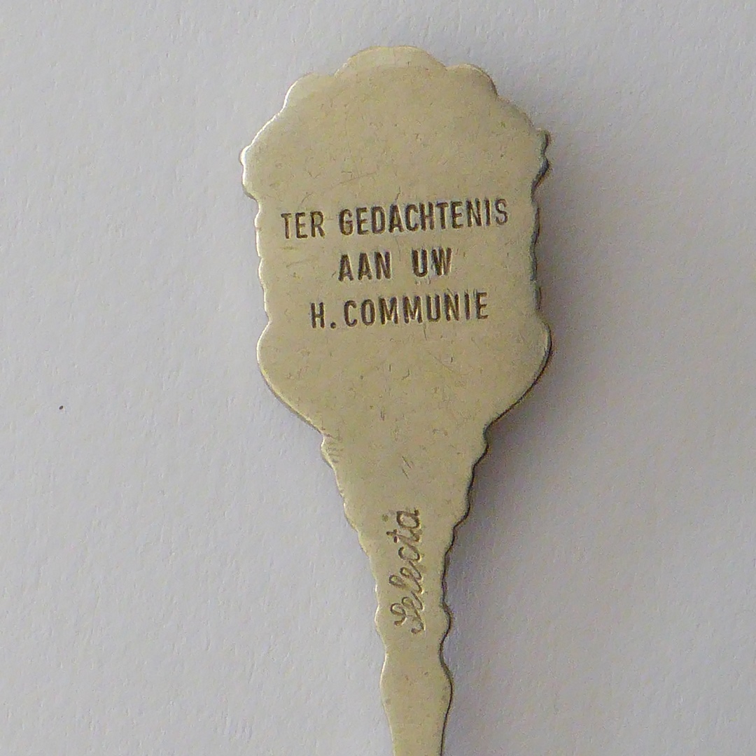 Theelepel met achterop "Ter gedachtenis aan uw H. Communie", met Jezus en Johannes