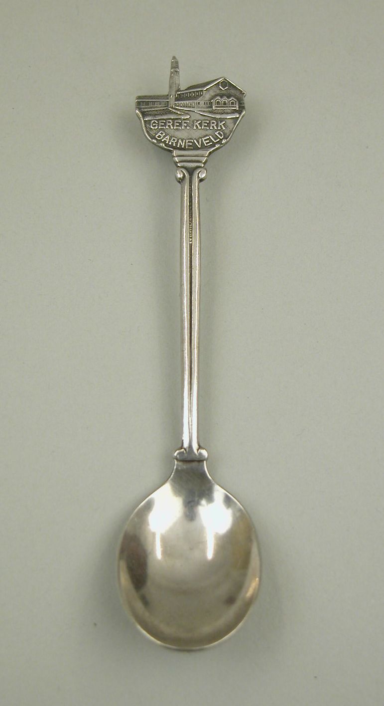 Theelepel met "geref. kerk Barneveld" met kerkgebouw