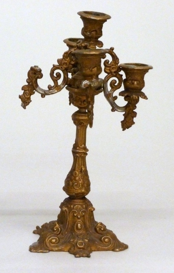 Kandelaar van verkoperd metaal met vijf armen waarvan een afgebroken