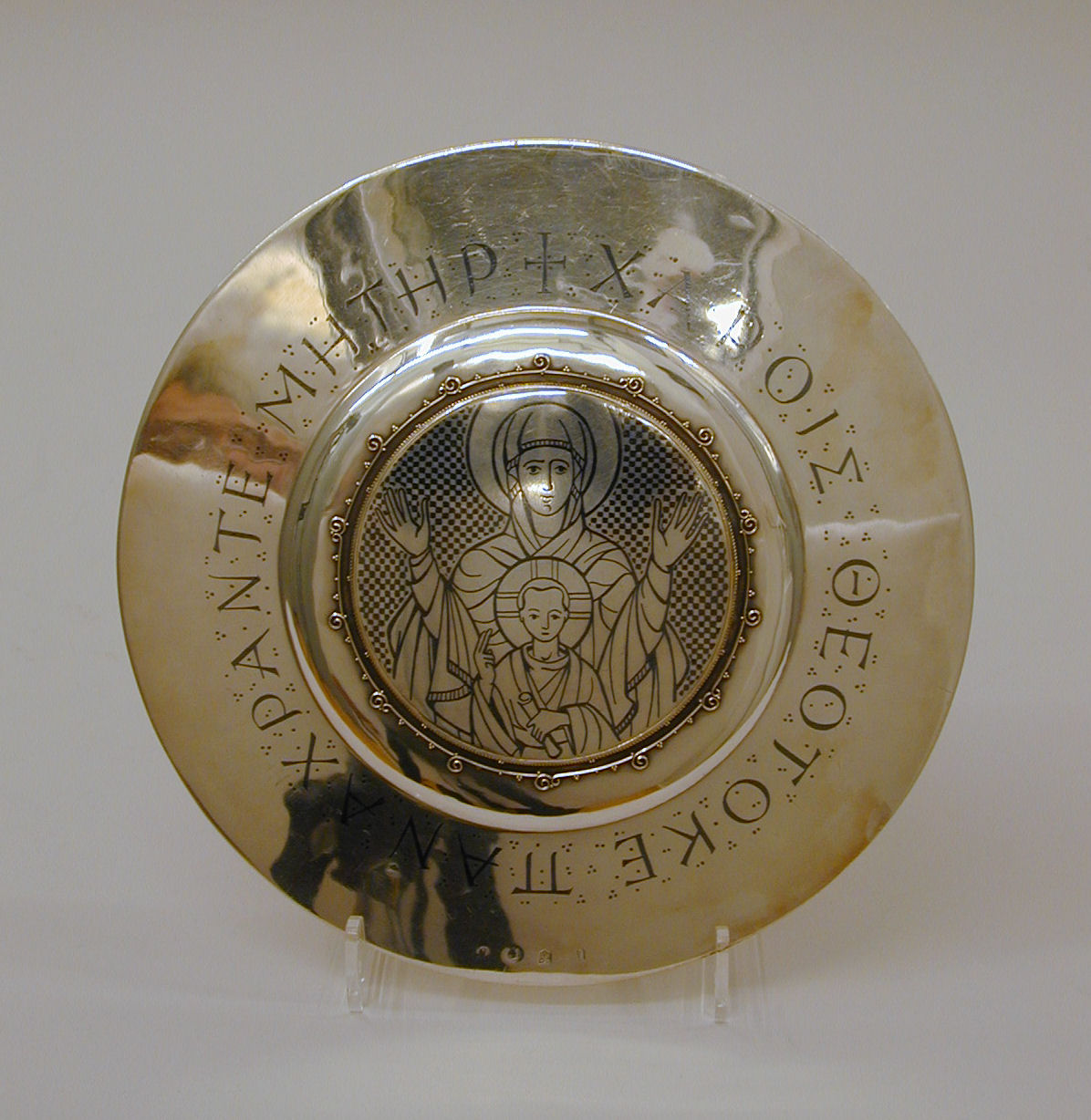 Pateen met Maria en Christuskind en Griekse tekst in niëllo