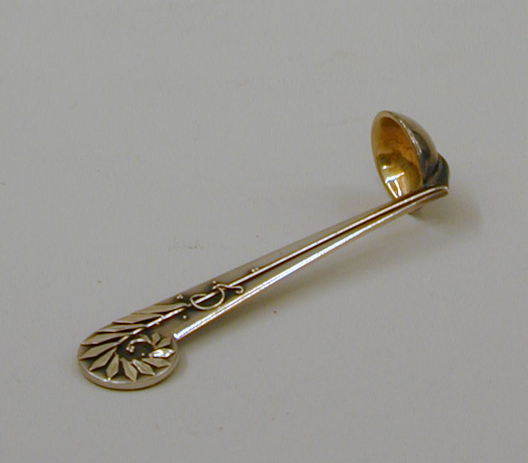 Kelklepel met opgelegde blaadjes en twee initialen op steel