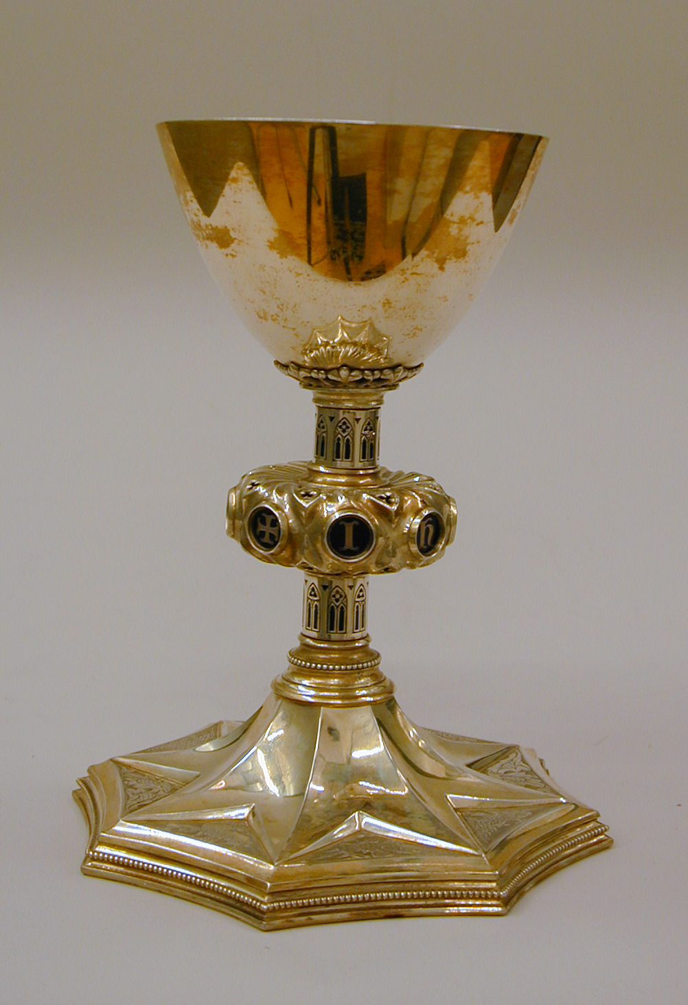 Kelk op achtkantige voet o.a. gegraveerd met lam met zegevaan en kelk, nodus met "IHE+SUS" in email