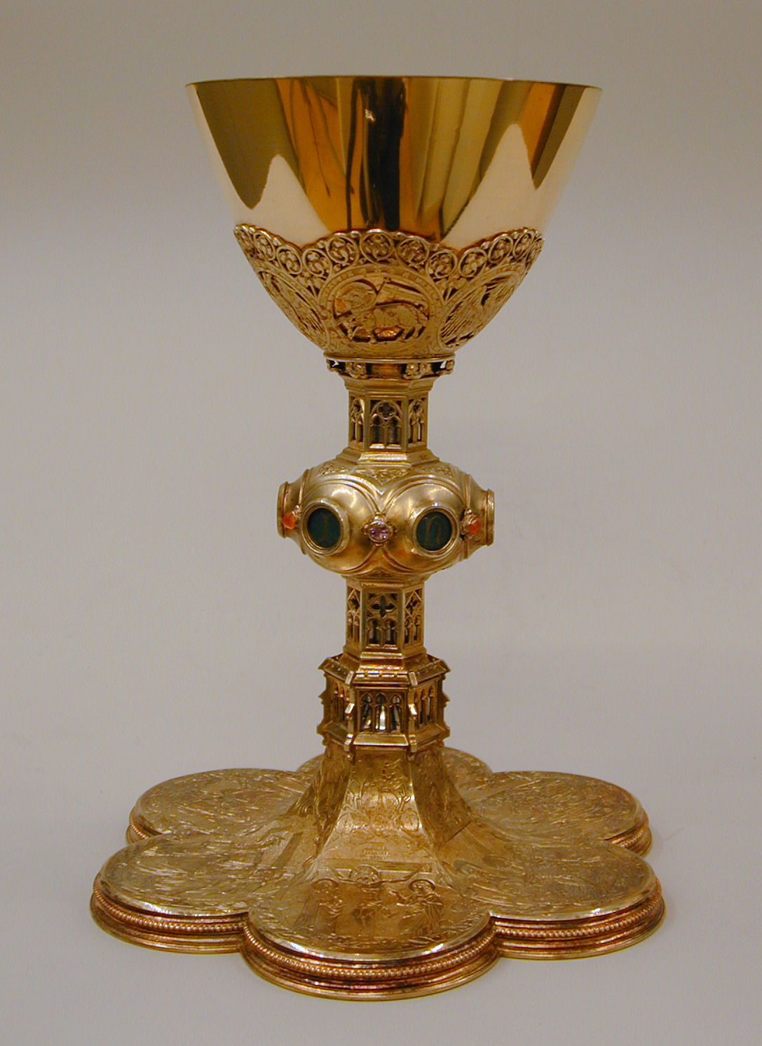 Kelk op zeslobbige voet gegraveerd met scènes uit het leven van Christus, o.a. geboorte, doop, vlucht naar Egypte en kruisdraging met Maria