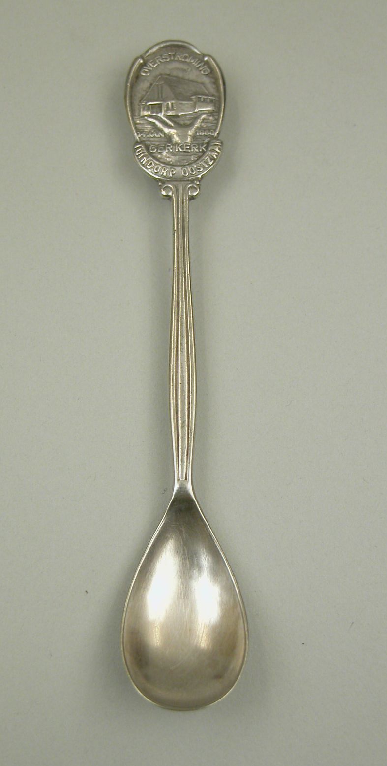 Theelepel met hand die kerkgebouw optilt, met "overstroming 14 jan 1960 ger. kerk ... Oostzaan"