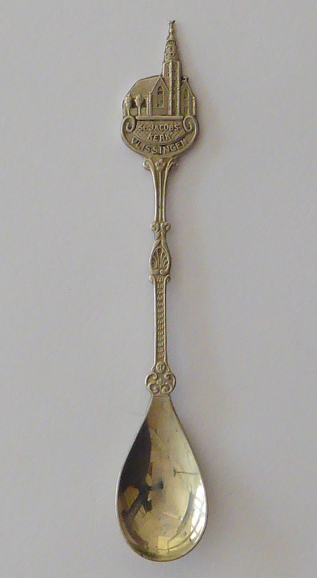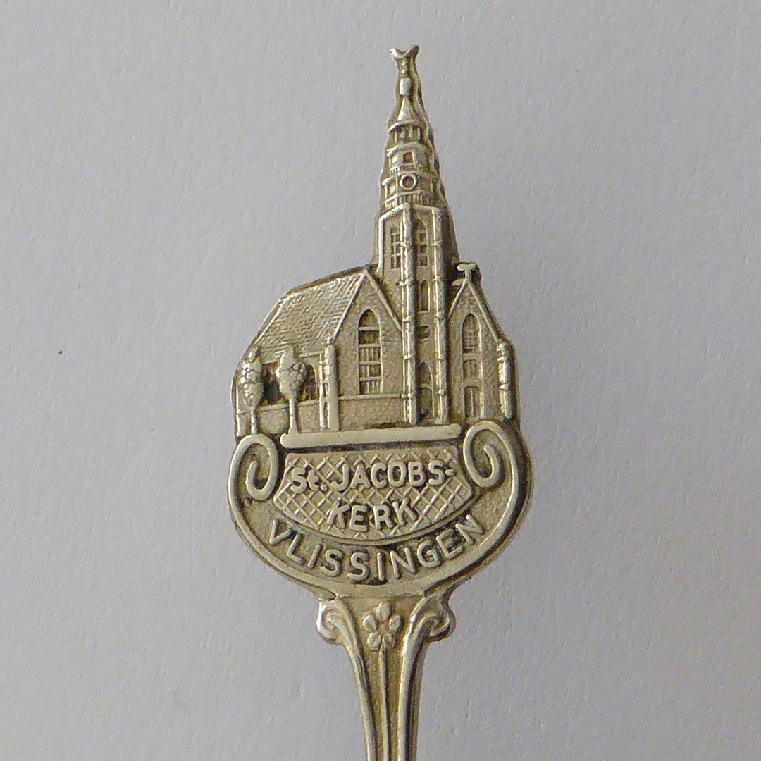 Theelepel met kerkgebouw, met "St. Jacobs-kerk Vlissingen"
