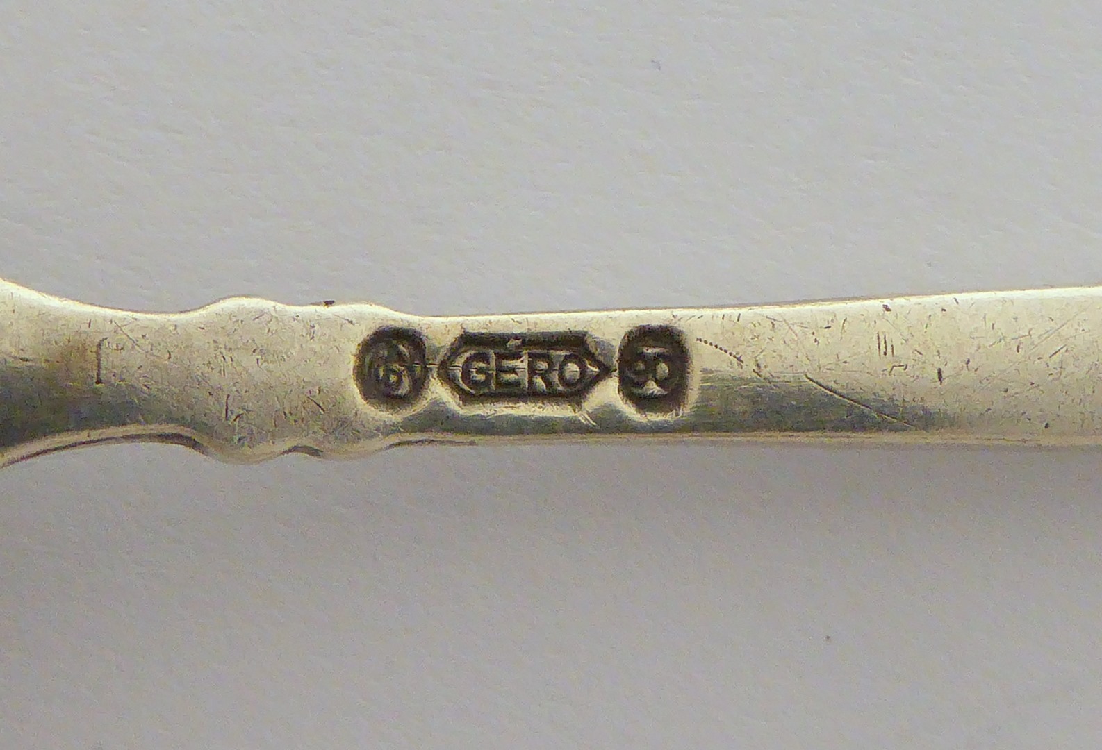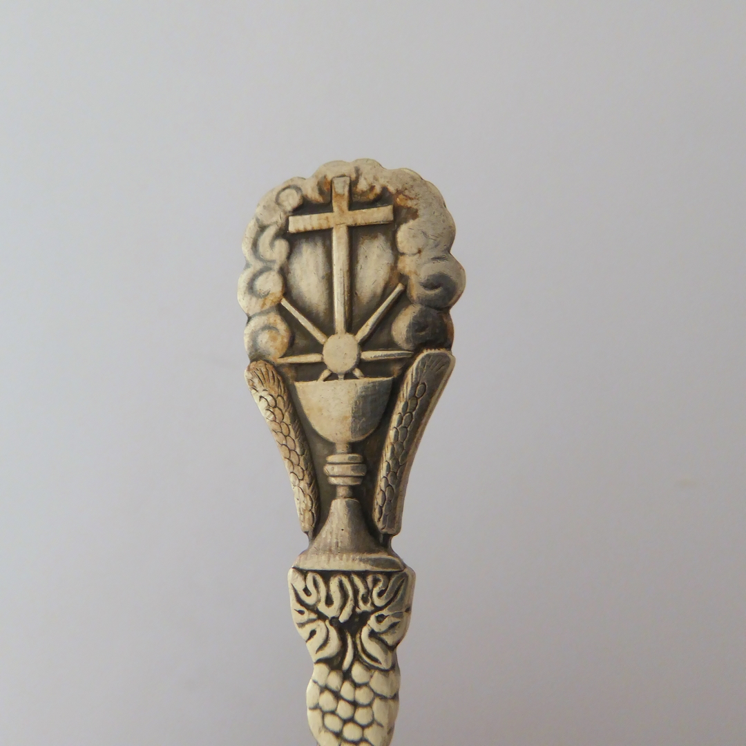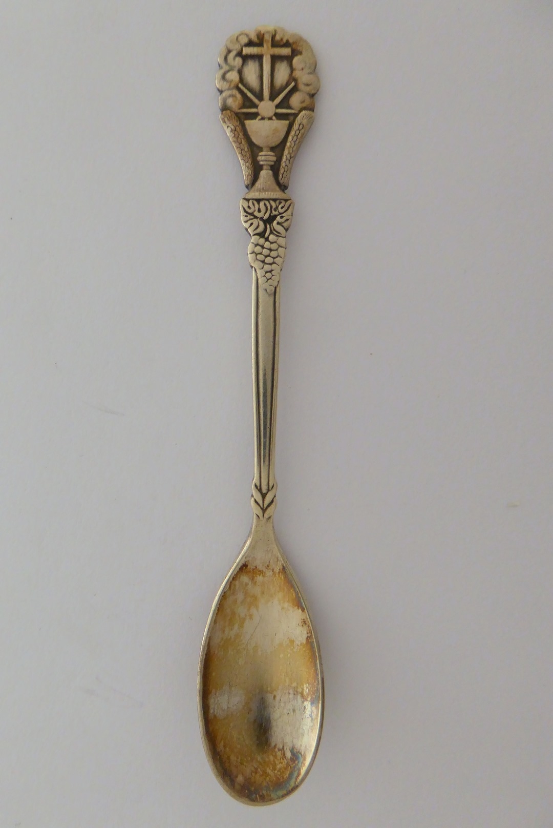 Theelepel met druiventros, kelk, hostie en kruis, achterzijde met "Ter herinnering ... H. Communie"