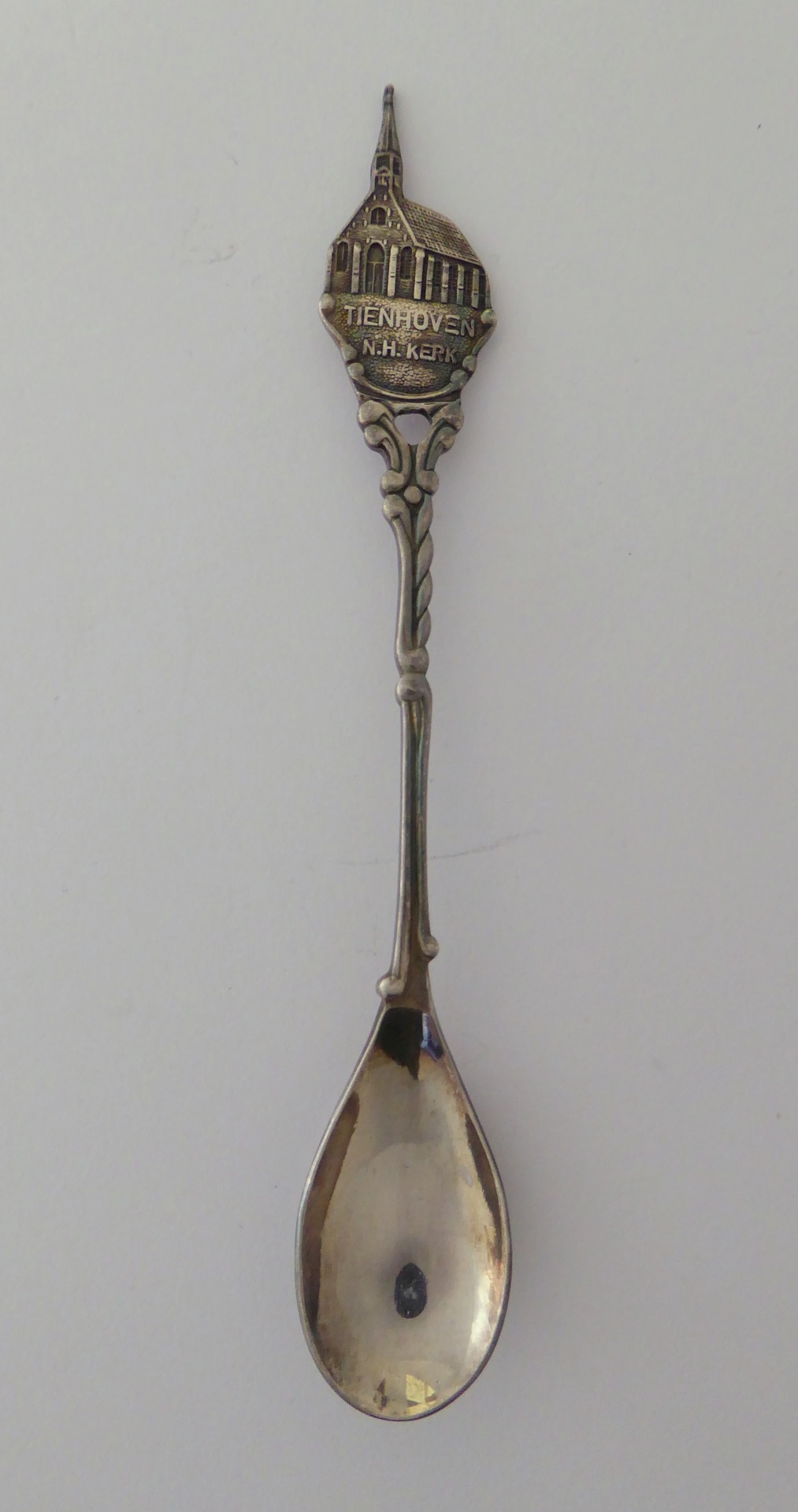 Theelepel met "Tienhoven N.H. kerk" met kerkgebouw