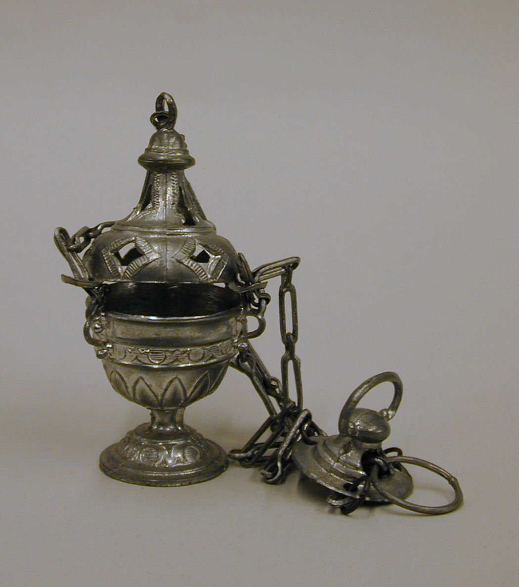 Speelgoedwierookvat op ronde voet met bladmotieven op vat