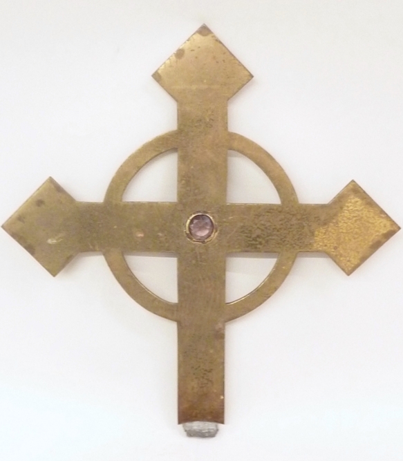 Vaandelbekroning, kruis met cirkel en geslepen glas in centrum