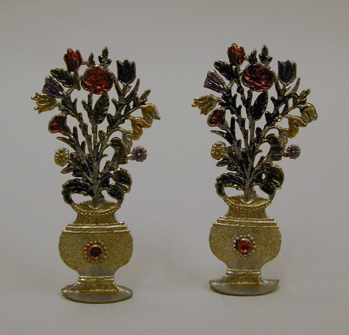 Platte siervaas met rode, paarse en goudkleurige bloemen