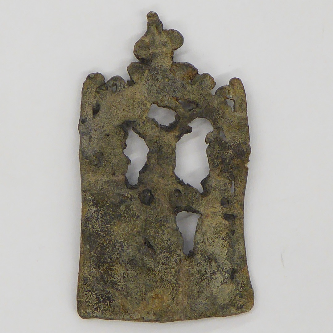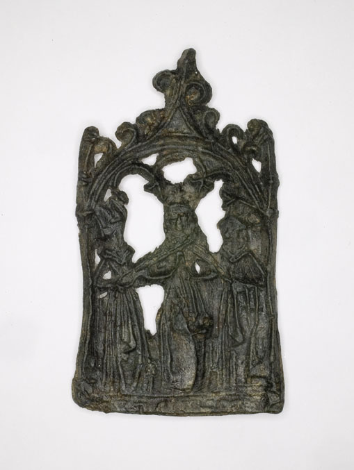 Bedevaartsinsigne H. Cunera, geflankeerd door twee vrouwen die de wurgdoek vasthouden