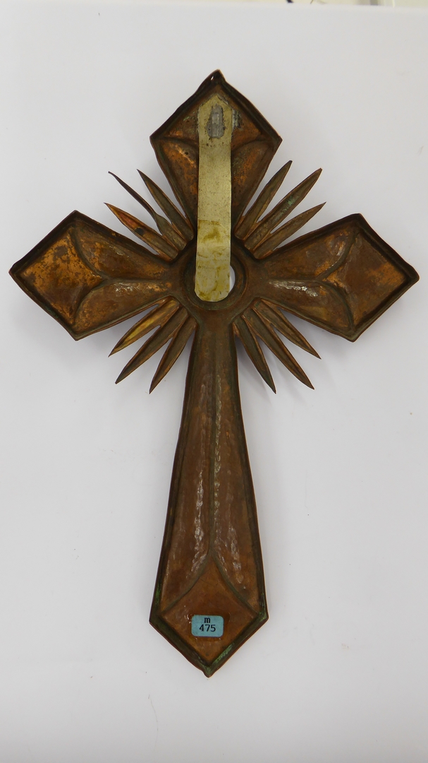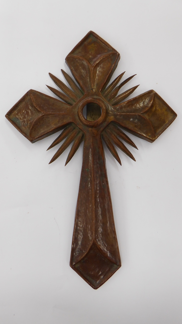Gehamerd roodkoperen reliekkruis met klem voor reliekmedaillon