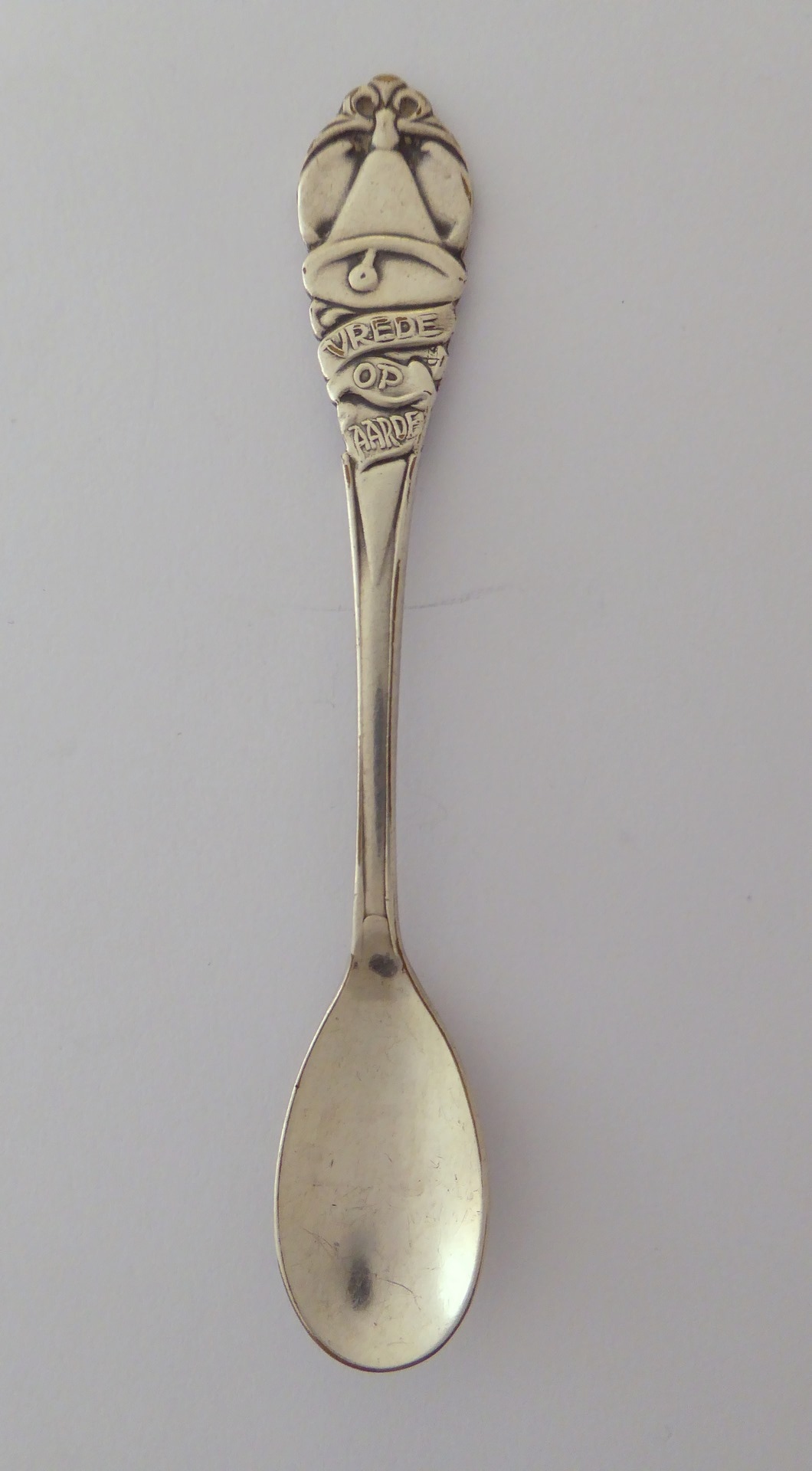 Theelepel, kerstlepel met klok en "Vrede op aarde", kz. met kerstboom en "Gelukkige kerst"