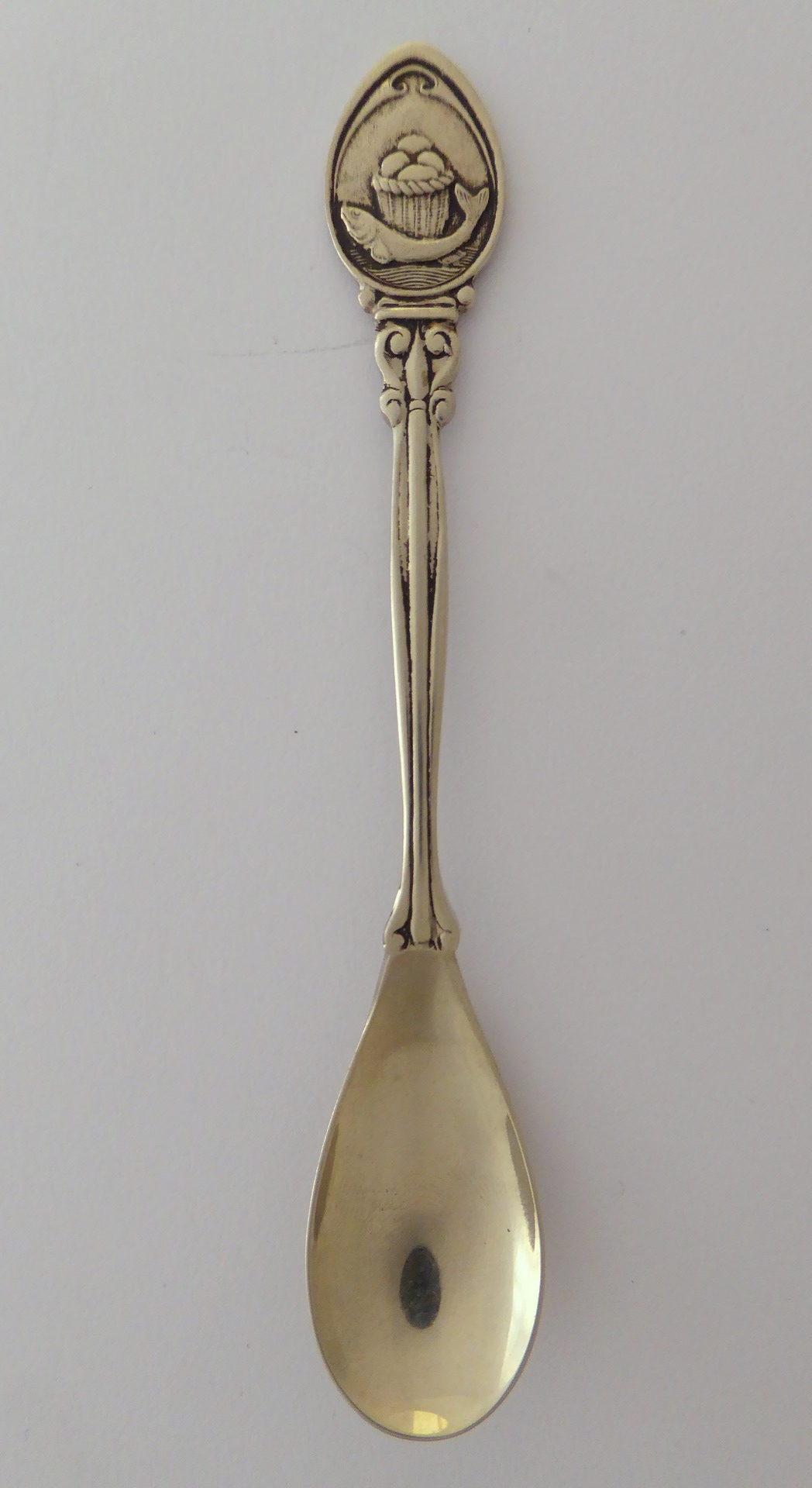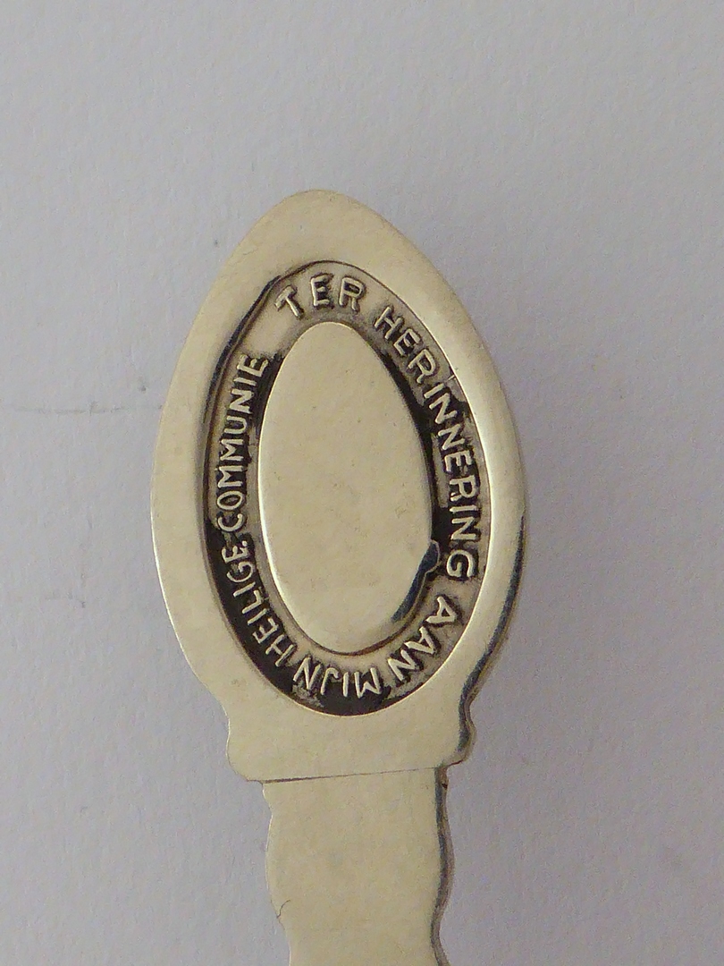 Theelepel met vis met mand vol broden, kz. met "Ter herinnering aan mijn heilige communie"