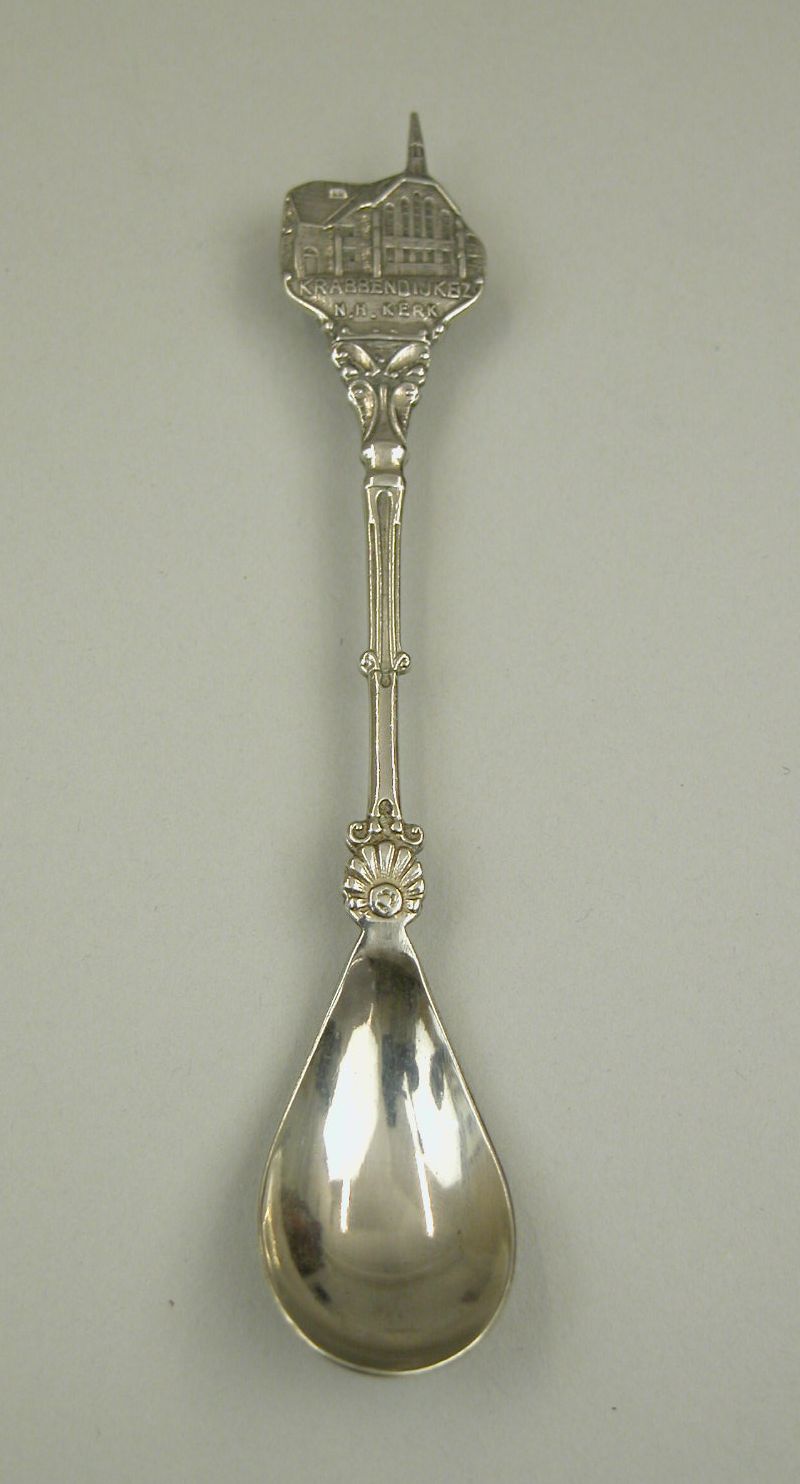 Theelepel met voorstelling van kerk, met "Krabbendijke (Z) N.H. kerk"