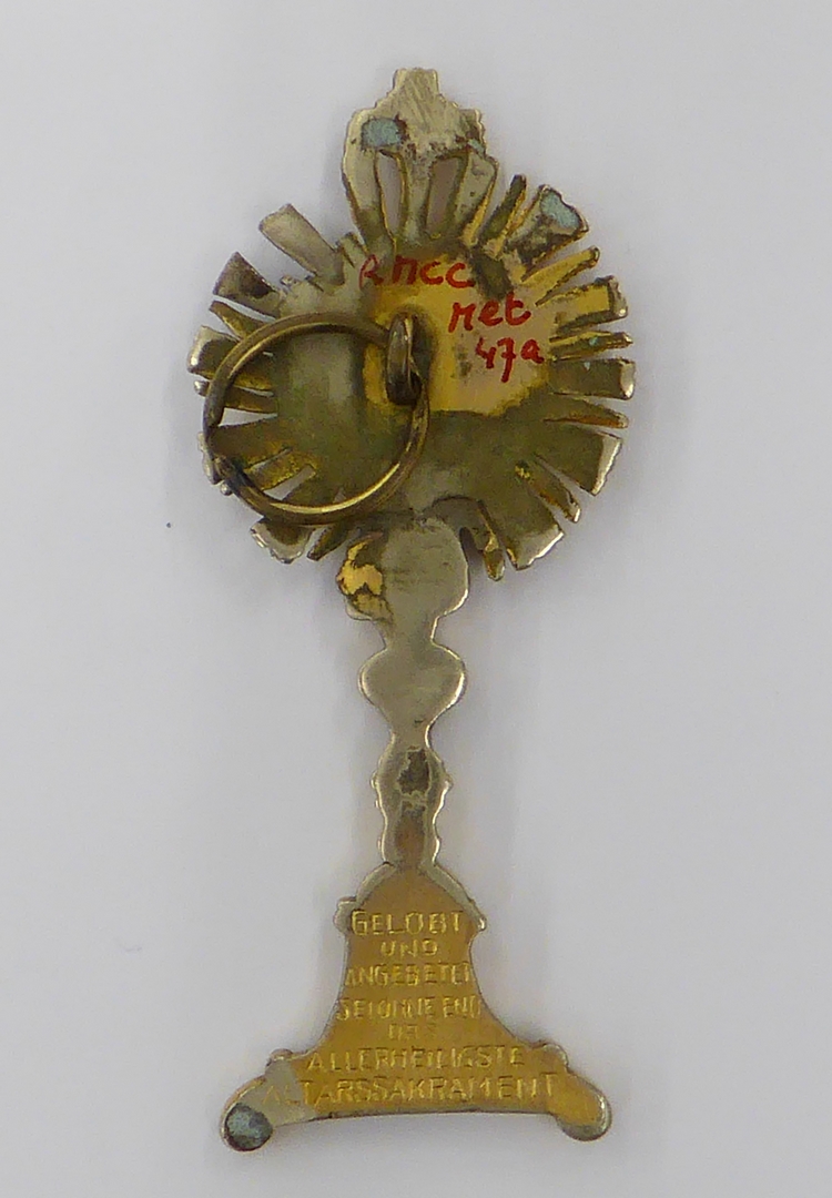 Monstransvormige hanger, gedragen door zrs. Altijddurende Aanbidding, kz. "Gelobt .."