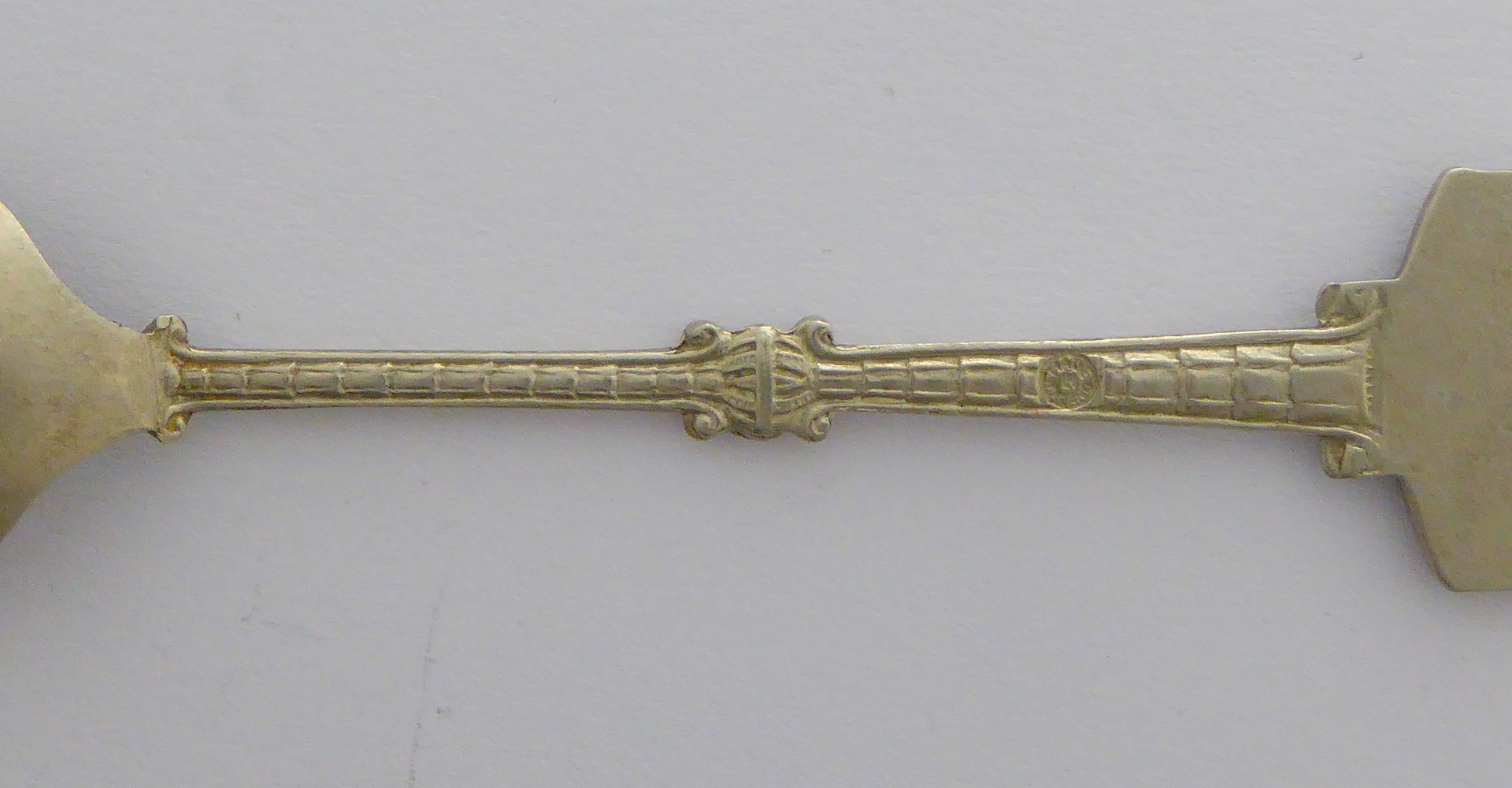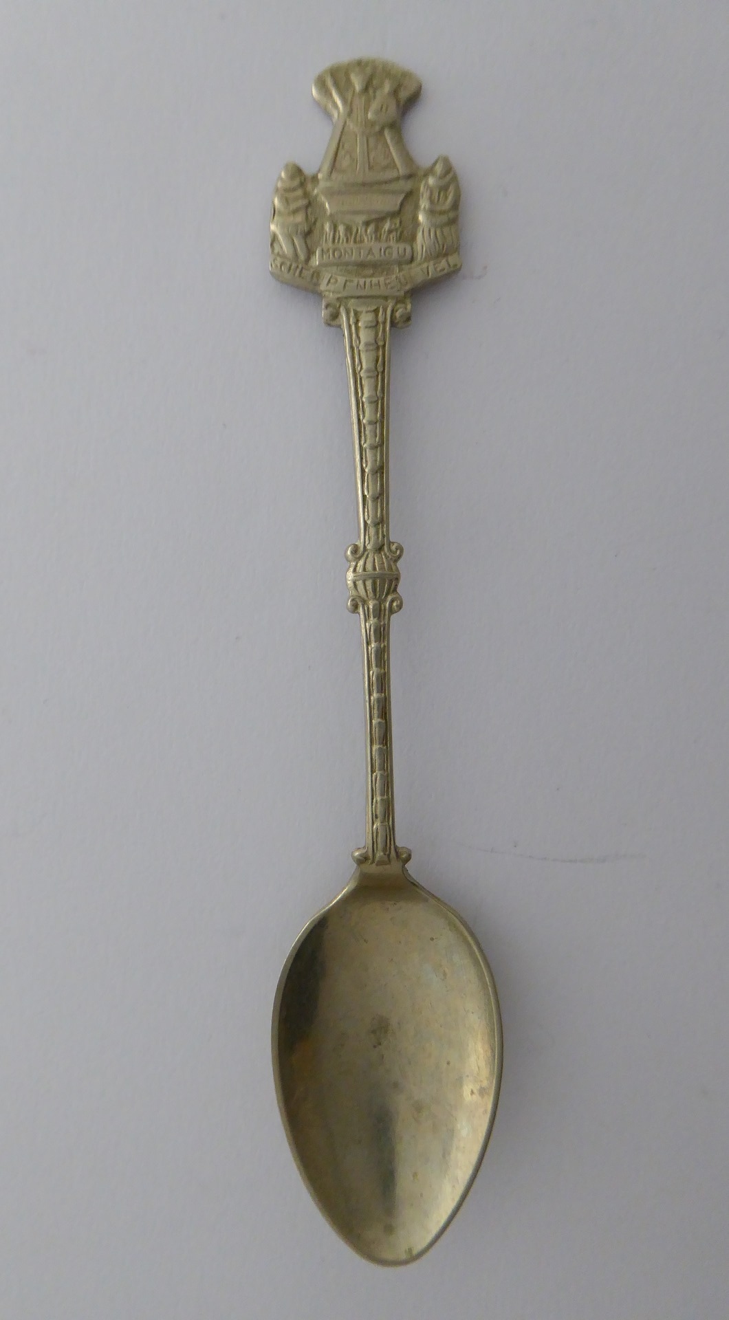 Theelepel met O.L.V. van Scherpenheuvel en Albert en Isabella, met "Montaigu Scherpenheuvel"
