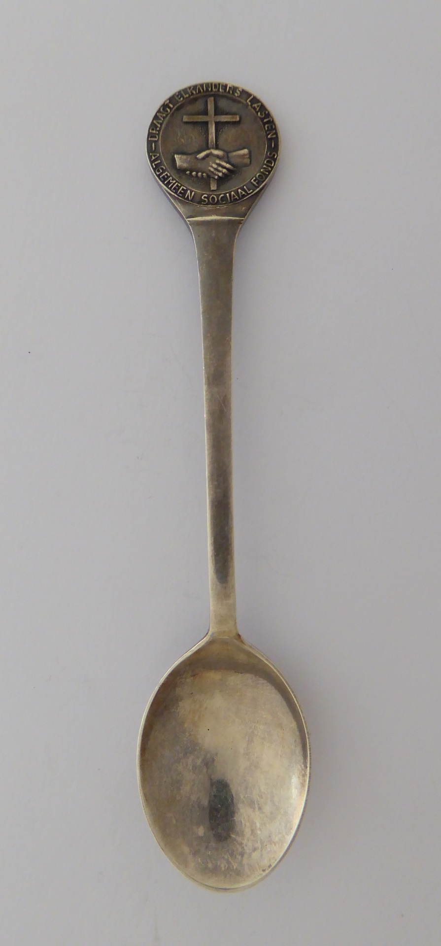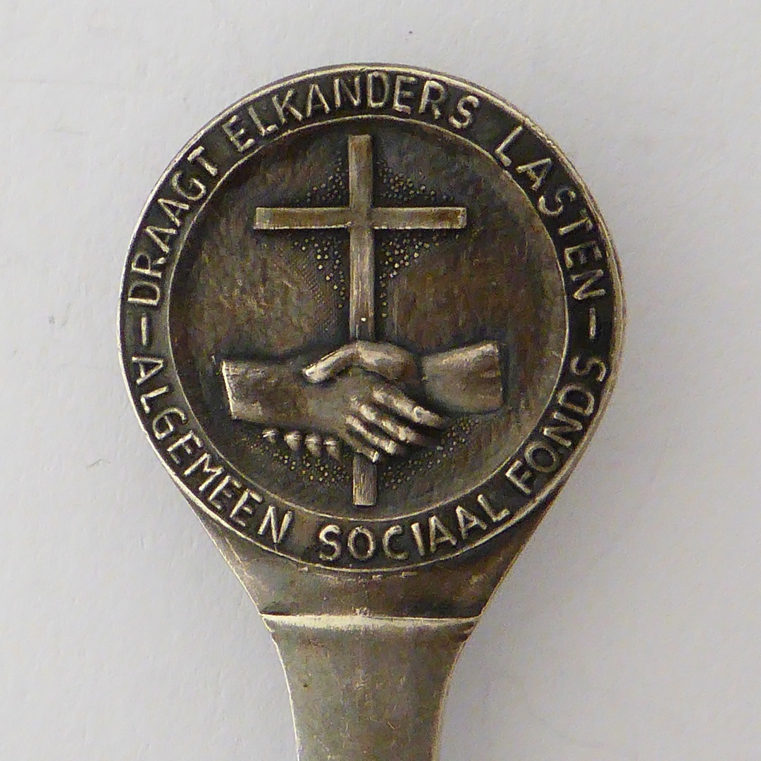 Theelepel met kruis en twee handen, met "Draagt elkanders lasten - Algemeen Sociaal Fonds"