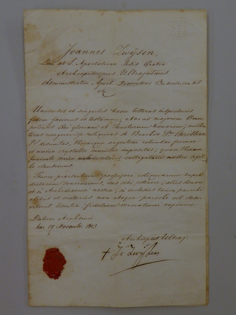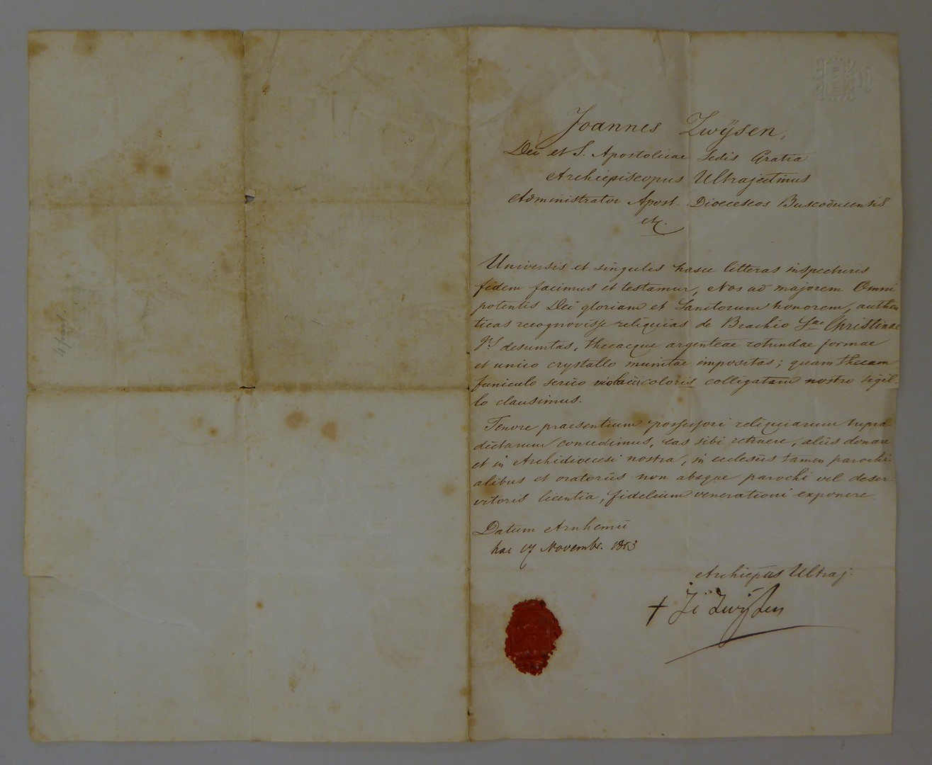 Echtheidsverklaring bij reliek van de H. Christina getekend door Joannes Zwijsen