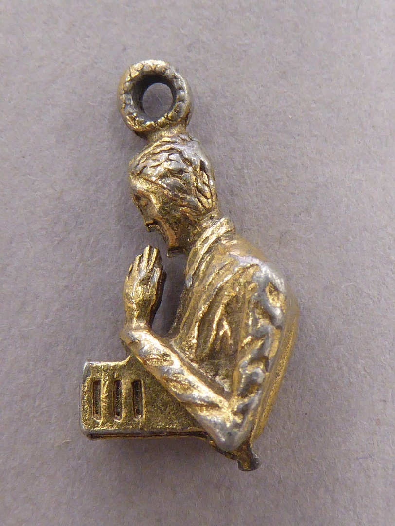 Hanger, bedeltje van bovenlijf biddende man met boek, H. Gerardus Majella(?)