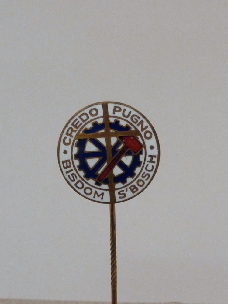 Speld Katholieke Arbeidersbond met rad, kruis, hamer en "Credo pugno, Bisdom s'Bosch"
