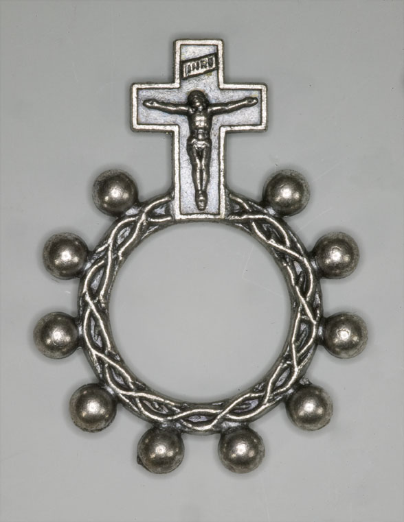Vingerrozenkrans, ring in vorm van doornenkroon waarop kruisbeeld, met kraalvormige weesgegroeten