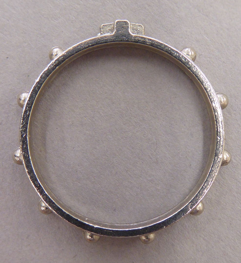 Vingerrozenkrans, ring waarop liggend kruisje, met knopvormige weesgegroeten