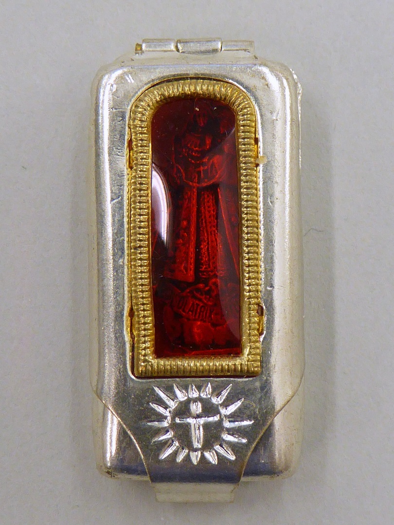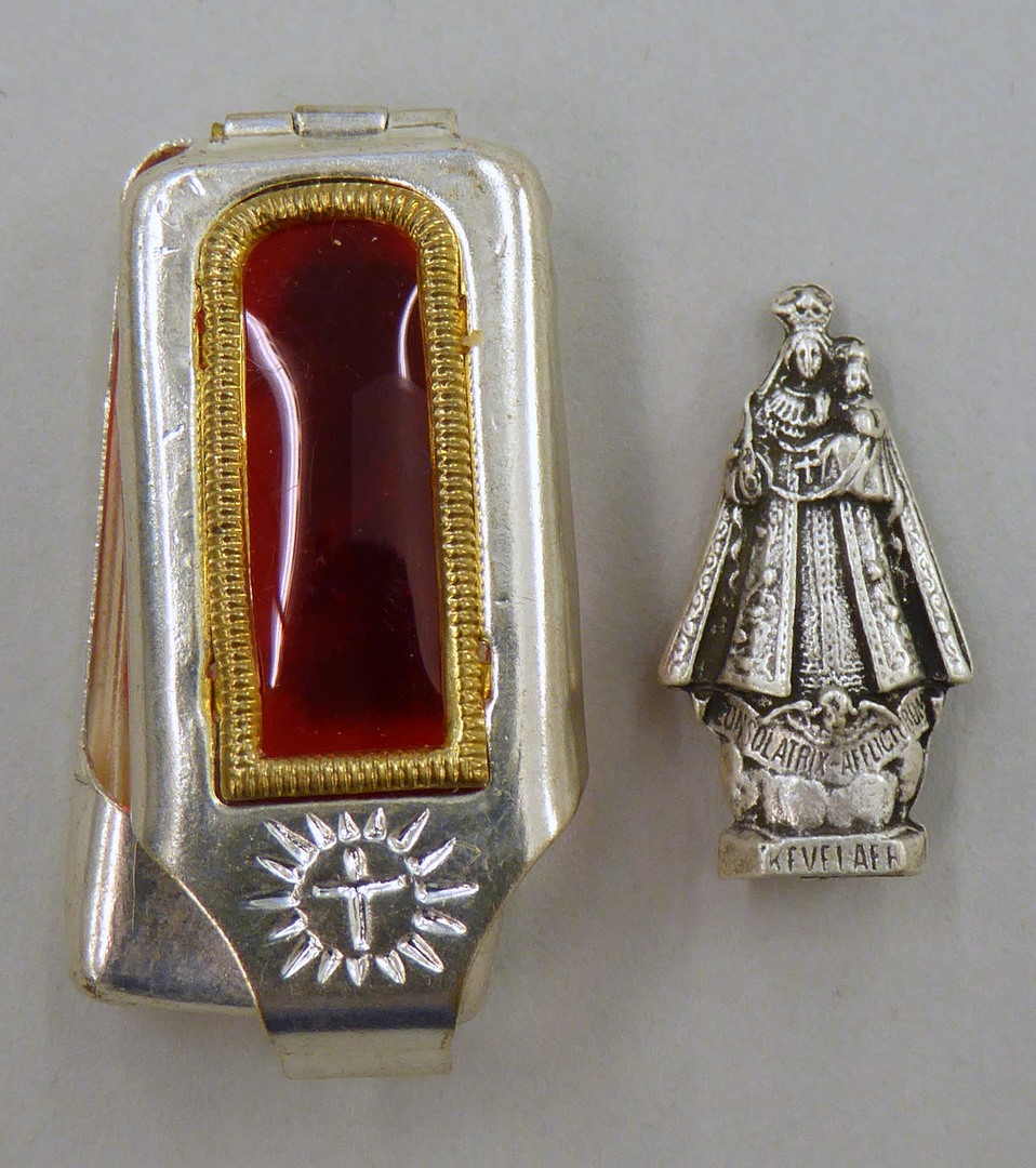 Zakheiligdom, beeldje voorstellend O.L. Vrouw van Kevelaer in metalen etuitje met rood raampje