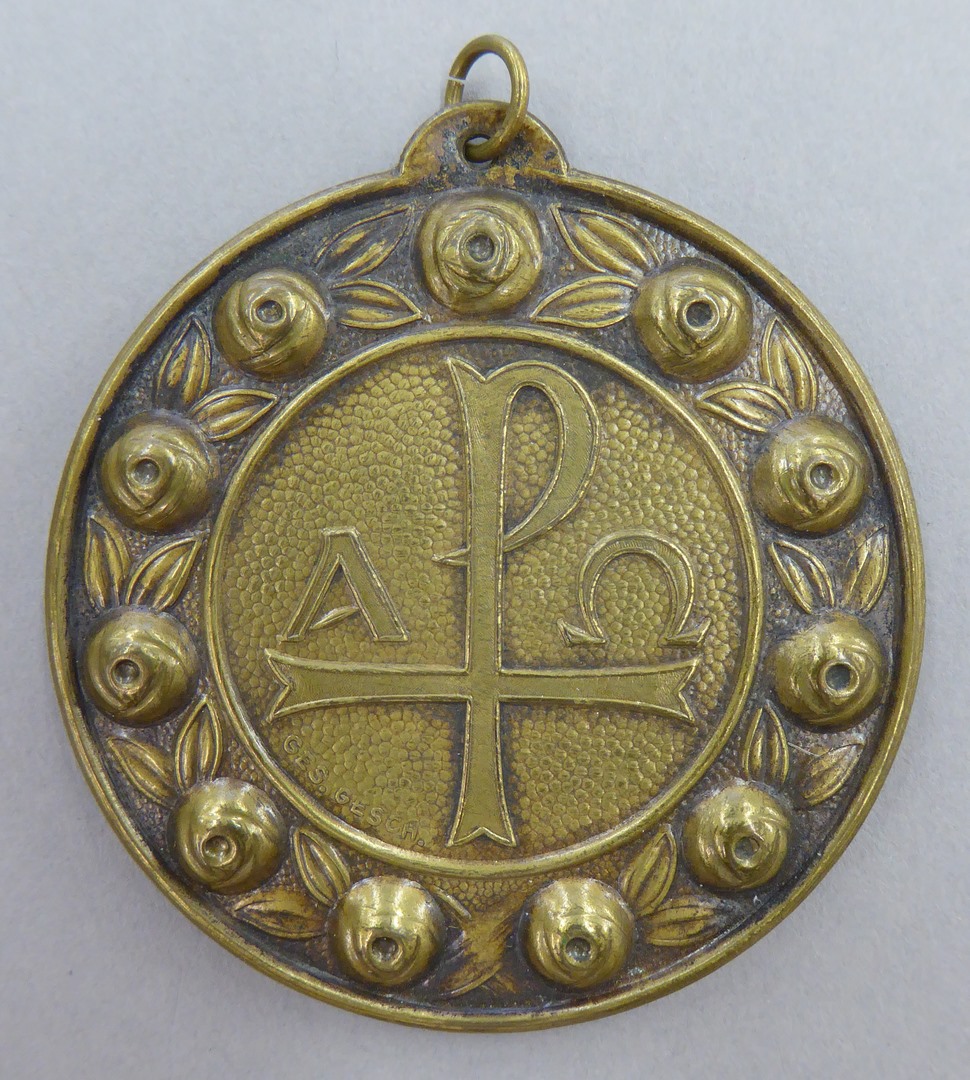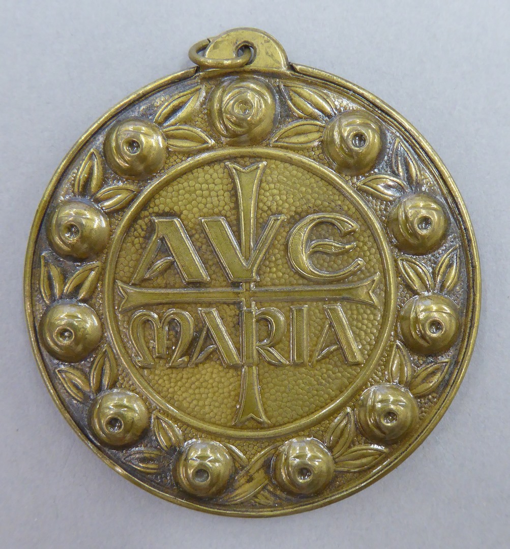 Vingerrozenkrans in de vorm van een medaille met tien roosjes en met "Ave Maria"