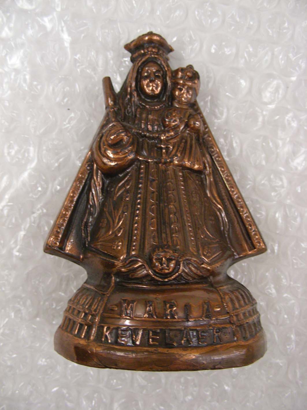 Roodkoperkleurig beeldje van O.L.V. van Kevelaer met op voetstuk "Maria Kevelaer"