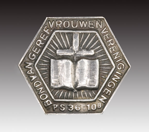Zeshoekig insigne met opengeslagen bijbel en "Bond van geref. vrouwenverenigingen ps. 36:10B"