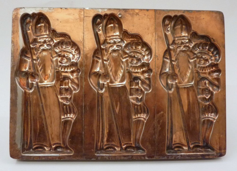 Chocoladevorm voor drie Sint Nicolaasfiguren met staf, met Zwarte Piet
