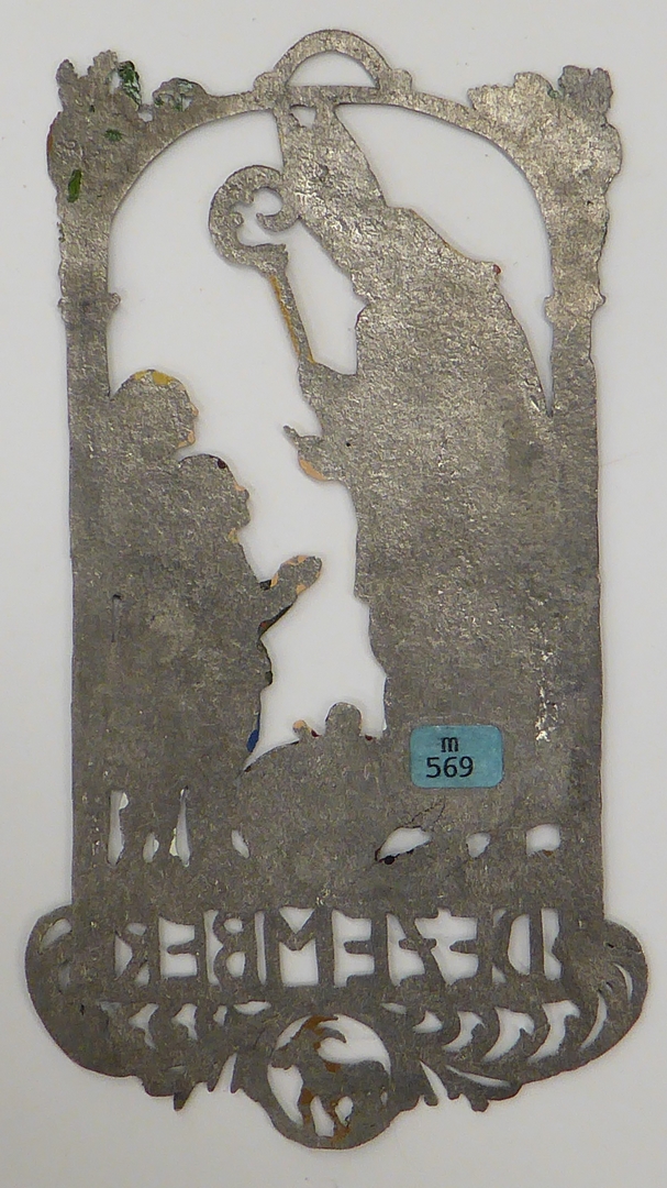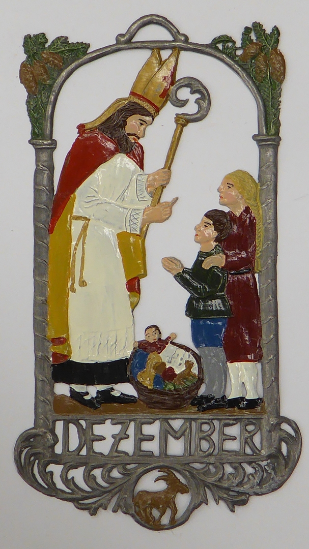 Reliëf met Sint Nicolaas, twee kinderen en mand met speelgoed onder boog en met "Dezember"