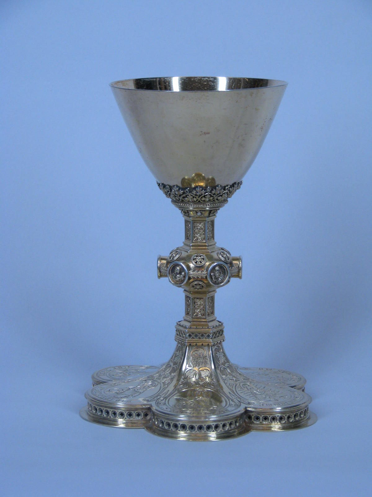 Kelk op zeslobbige voet met o.a. Christus H. Hart, St. Hildegardis en evangelist Johannes