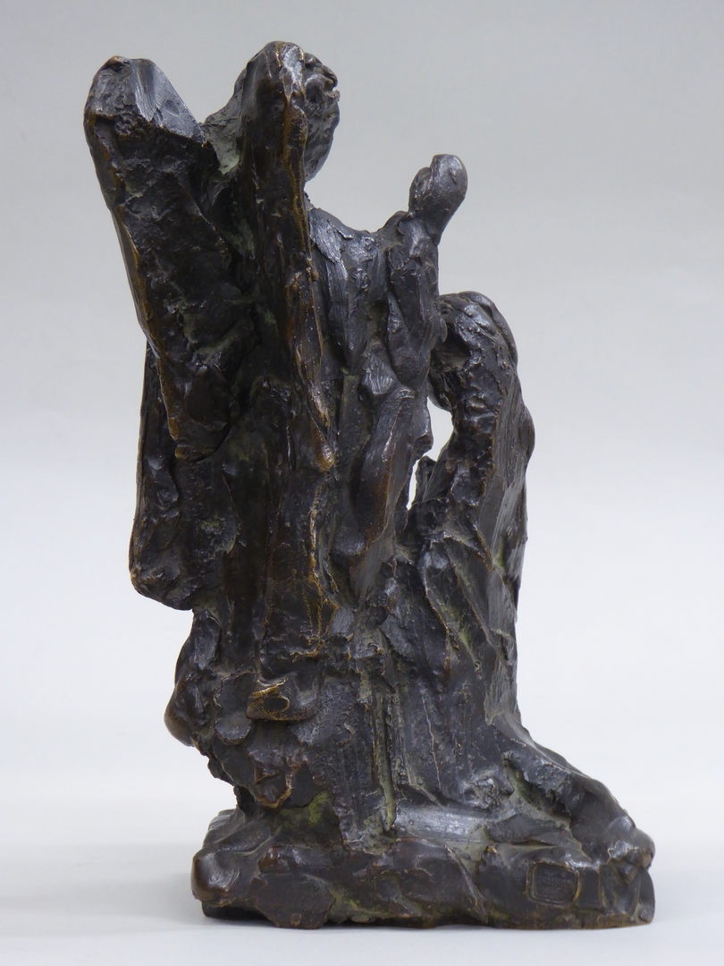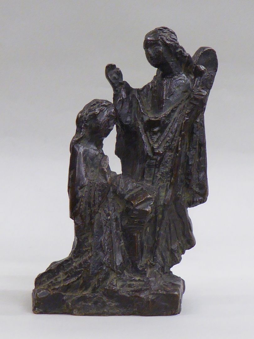 De engel nadert Maria van rechts. Zij zit geknield achter een bidstoel waarop een opengeslagen boek ligt. Hoewel zij haar hoofd gebogen heeft alsof zij nog leest, heeft zij haar linkerhand opgeheven. Zij moet de boodschap van de engel over haar uitverkiezing reeds gehoord hebben en buigt als dienaar des heren deemoedig haar hoofd. De ...