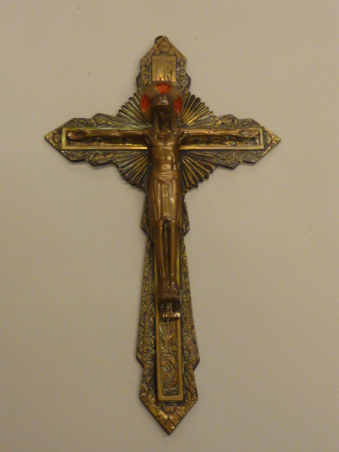 Christus aan het kruis waarop in reliëf INRI en florale motieven, kz. met "Ayez pitie de nous"