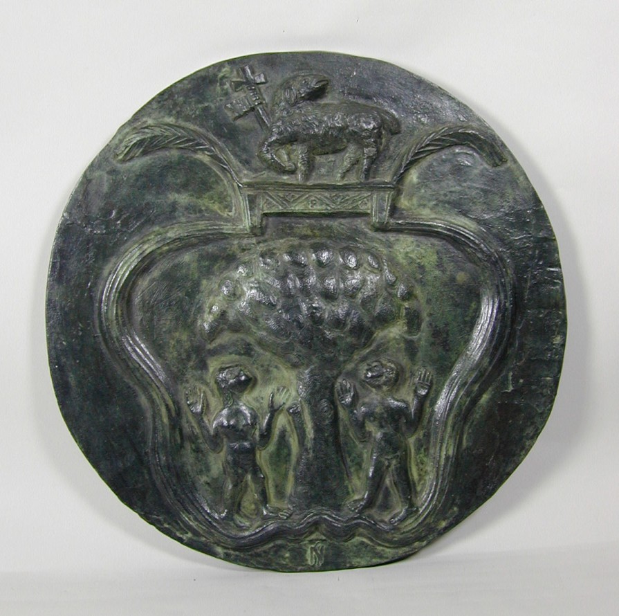Afgietsel van altaarreliëf Sint Willibrorduskerk Arnhem met Adam en Eva onder de levensboom en Lam Gods met kruisvaan